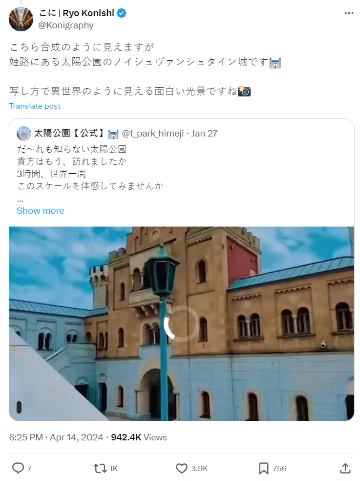 當然這可不是合成的,這個位於姬路市的建物其實是「太陽公園」園內的「白鳥城」,以德國的新天鵝堡 (ノイシュヴァンシュタイン城 ) 為概念打造,也在日本德國大使館附近,是一個匯集了世界各地遺產和建造物復刻品的主題公園,也是姬路市當地非常著名的觀光景點。