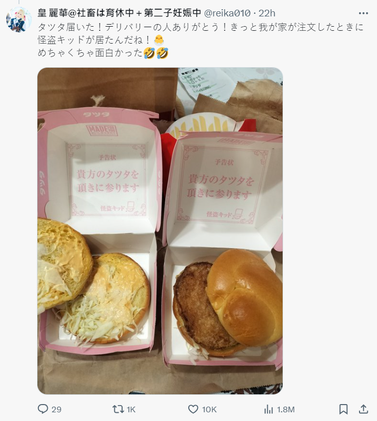 不過有位推主或許是特別幸運 ( ? ),她分享了自己買回用餐時,卻意外發現漢堡裏面居然料不見了,只剩下生菜跟沙拉,更嘲諷的是剛好配上怪盜基德的盒裝且附上預告狀,這樣的經驗分享在 X 上後笑翻網友,成為關注焦點。