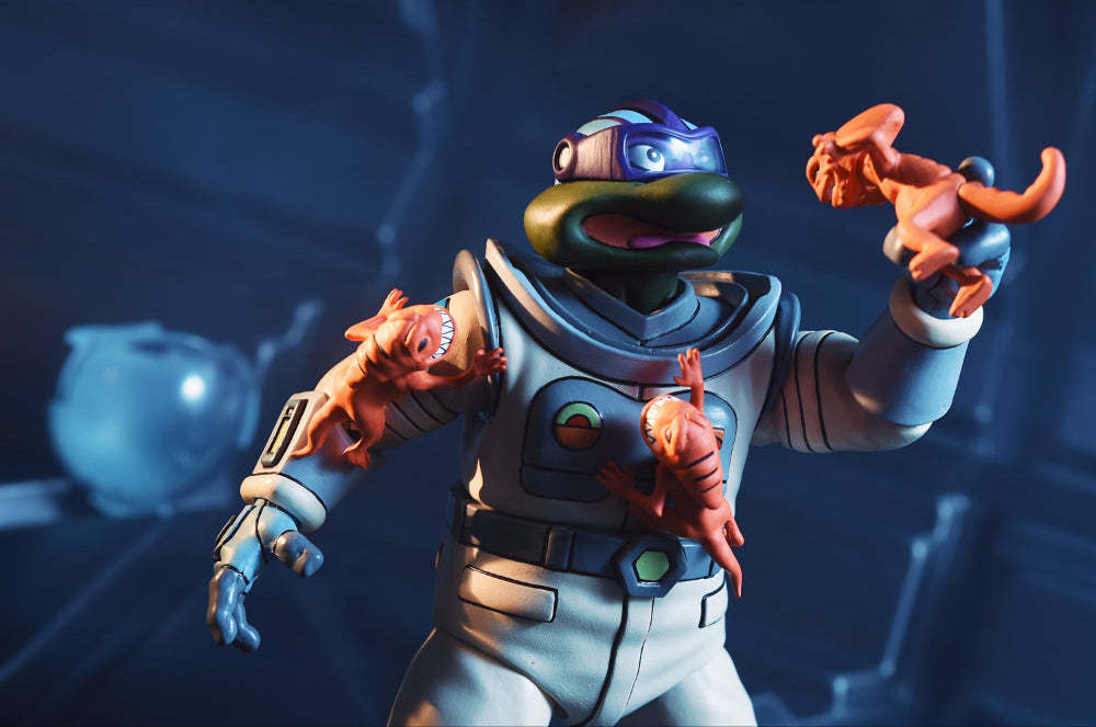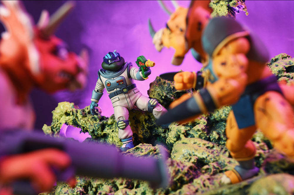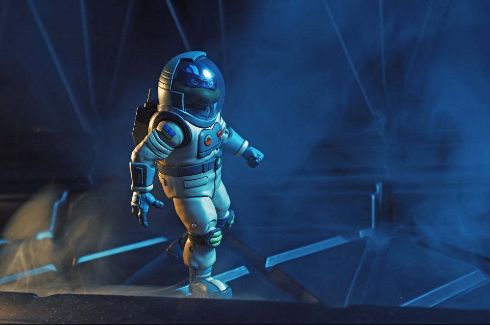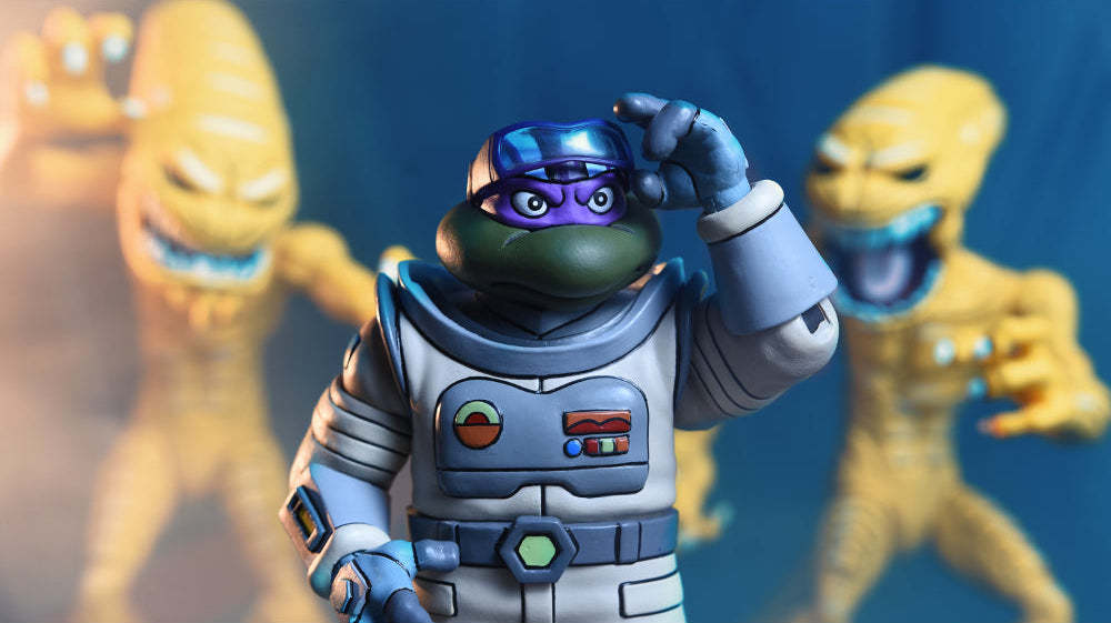 繼「龐克偽裝烏龜」後,這次 NECA 為我們帶來的雙人組合包以 1987 經典動畫版風格打造多納太羅和米開朗基羅劇中的兩款特殊造型,塗裝維持了 NECA 在卡通版忍者龜一慣的高品質,以平塗與黑色描線條的上色方式重現賽路路片動畫的美術風格。太空冒險多納太羅還原了多納太羅身著太空服的造型,身上作有各種極具科技感的配件與設計,配件附上了太空服頭盔、手槍、推進器、對講機等道具,讓多納太羅能夠在太空中展開精彩的冒險!