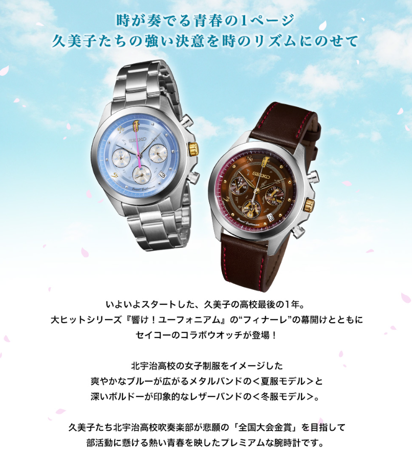 這次 SEIKO 與其聯名錶,以劇中的北宇治高中制服為靈感設計,分別推出兩款為夏季制服與冬季制服的樣式,兩款風格截然不同,但都是以劇中元素與特色製作而成,提供給粉絲不一樣的選擇。