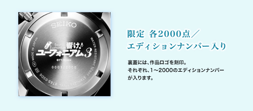 每一款錶背都有限量的數字編號,與電視動畫第3期《吹響吧!上低音號3》的 Logo。