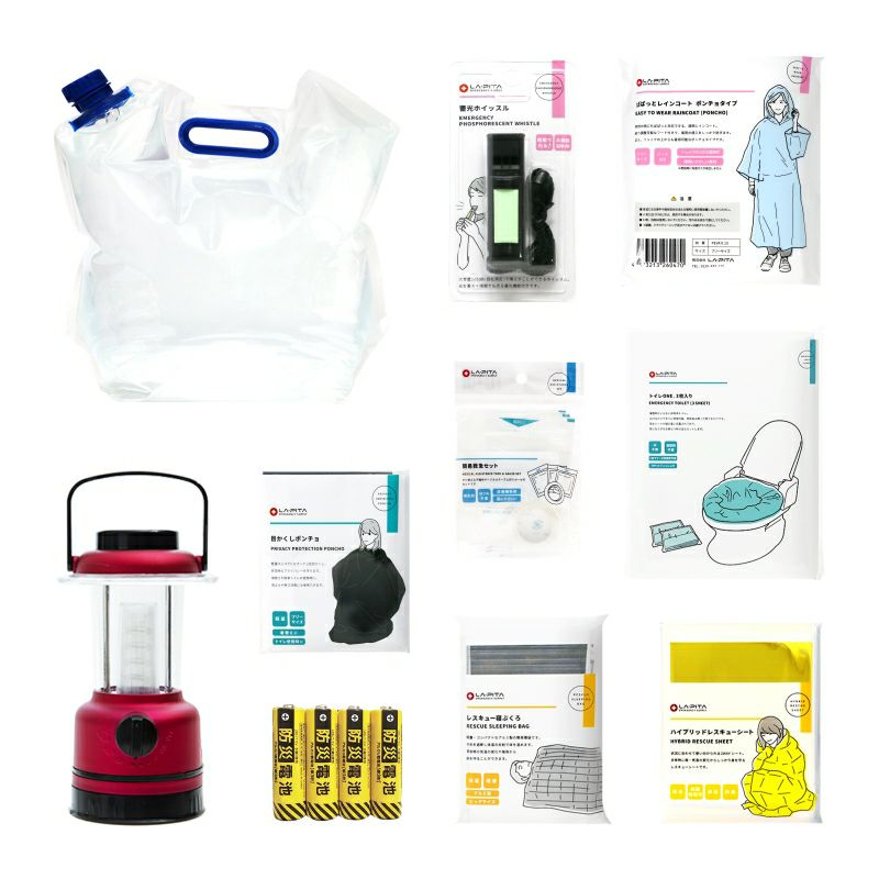 生活備品則包含 : 水袋10L 、便攜式廁所 ( 3件 )、雨衣、救援布、危急專用禦寒毯、蓄光用口哨、救援睡袋、防災露營燈、防災電池(4號電池)、簡易急救套裝,都是遇到緊急危難的必備的防災配備。