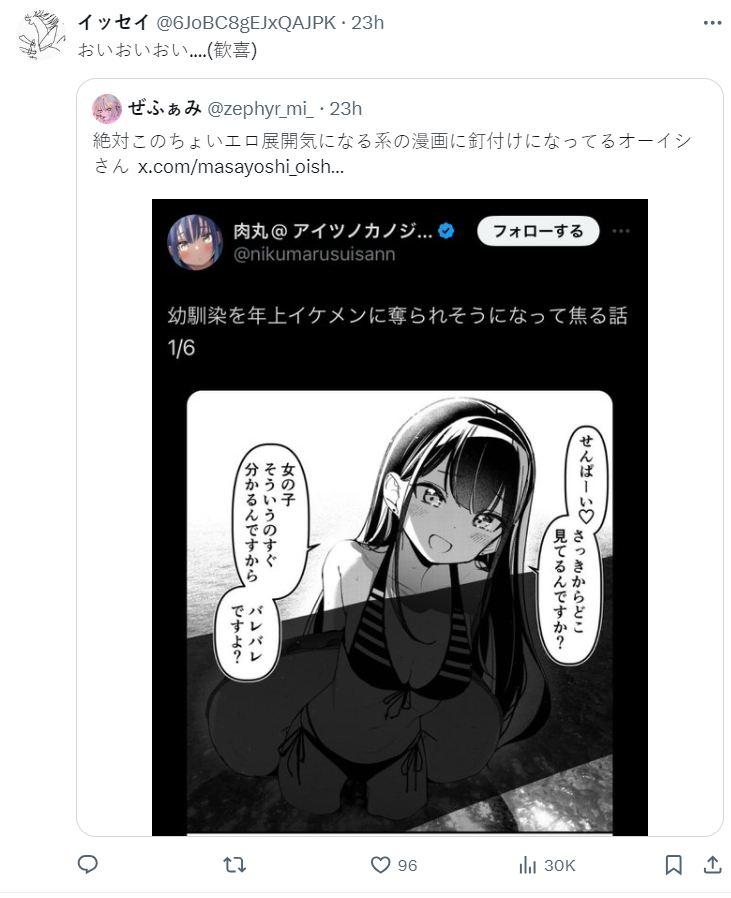 結果眼尖的網友發現,大石昌良手機螢幕的畫面應該是漫畫家肉丸 ( @nikumarusuisann ) 的貼文畫面,還找到剛好吻合的漫畫貼文,似乎是帶有色色意味的作品,網友的眼睛真的是火眼金睛阿...