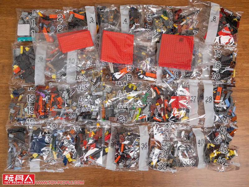 ▼ 那我們就趕快拆開來玩吧~這盒的內容包含 44 包編號零件+3 包紅色底版零件,以及兩本說明書、兩張一共有 60 片零件要貼的貼紙(汗)。