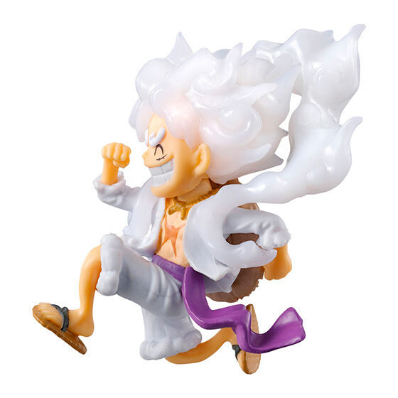 將轉蛋殼化身惡魔果實、連尾田榮一郎老師都激推的「From TV animation ONE PIECE 惡魔果實」轉蛋,在高約 90 mm 的轉蛋殼中還原了惡魔果實的造型,並且設計為可以拆開組裝、疊放為展示架的多功能透明環保轉蛋殼,整組收藏超壯觀!本次的『GEAR 5 collection』,採用 Q 版詮釋,收錄有三種不同配色的五檔魯夫,還原煙霧造型與白色、金屬銀、透明乳白色塗裝,惡魔果實也特別使用如月亮一般的黃色,兼具可愛與細節!