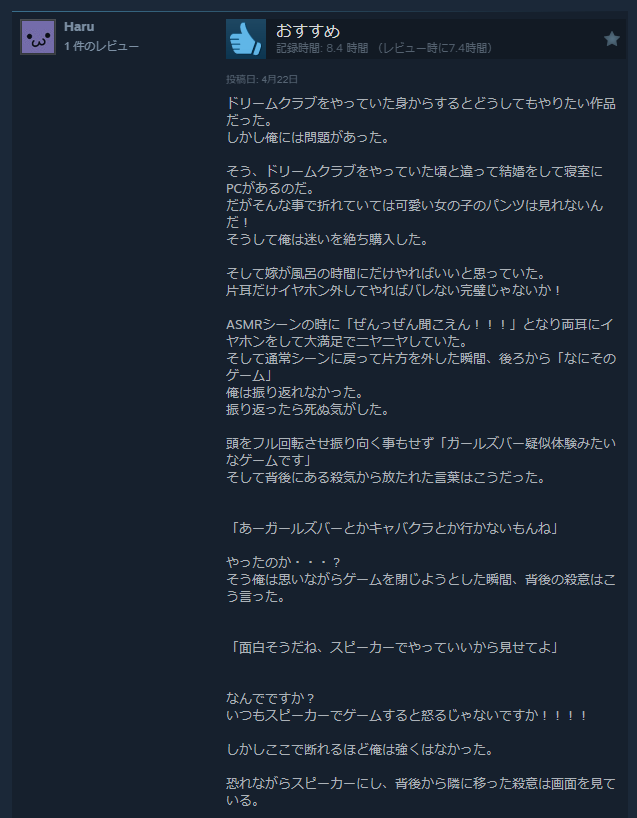 想說趁老婆洗澡的時候開玩,只戴一邊耳機就可以臨機應變。卻在獎勵 ASMR 劇情因為聽不到全部,就戴上兩耳了,沒多久就聽到背後傳來老婆的聲音 : 「這是怎樣的遊戲 ?」。感覺到背後都涼了的自己只好回應 :「這是個模擬體驗 girl's bar 的遊戲。」,老婆輕輕的回 : 「啊 ~ 畢竟你都不上girl's bar或酒店的嘛。」