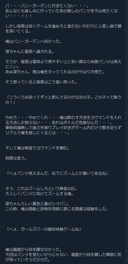 突然自己感覺不敢上兔女郎店消費,原本療癒的小褲褲漸漸離自己而去,老婆卻用手指戳自己的膝蓋催促趕快進店裡去。結果還被凜 ( 遊戲角色 ) 帶到包廂,老婆提問說 :「這種店的女孩一直喝都不會喝醉嗎 ? 」,自覺安危受到威脅,只好點了ヨウマンド給凜。