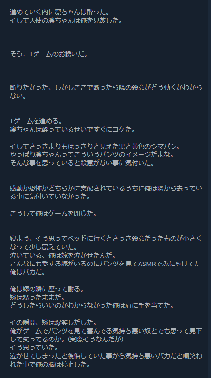 結果到了扭扭樂遊戲 ( T 遊戲 ) 的環節,凜因為醉了的關係很快就倒地了,我卻沒發現身旁的殺氣默默地離開了,於是關閉了遊戲。來到床邊躺下時卻感覺到老婆縮著身子微微顫抖,還有啜泣聲,體認到明明就有這麼深愛的老婆在卻看小褲褲又聽著 ASMR 奸詐笑著的自己錯了。