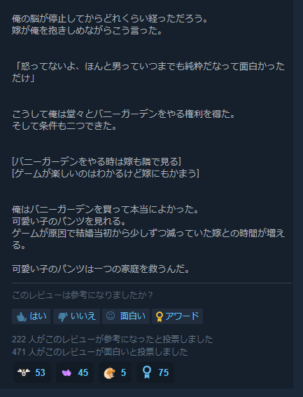 評論玩家提到,他過去曾玩過同為紳士遊戲的《美夢俱樂部》,所以這款《兔兔秘密花園》是個無論如何都想玩的遊戲,但問題自己現在已婚,電腦又擺在房間,但如果是因為這樣的現實可是看不到可愛女孩的小褲褲並體驗遊戲樂趣,決定還是不畏艱難買下去了。