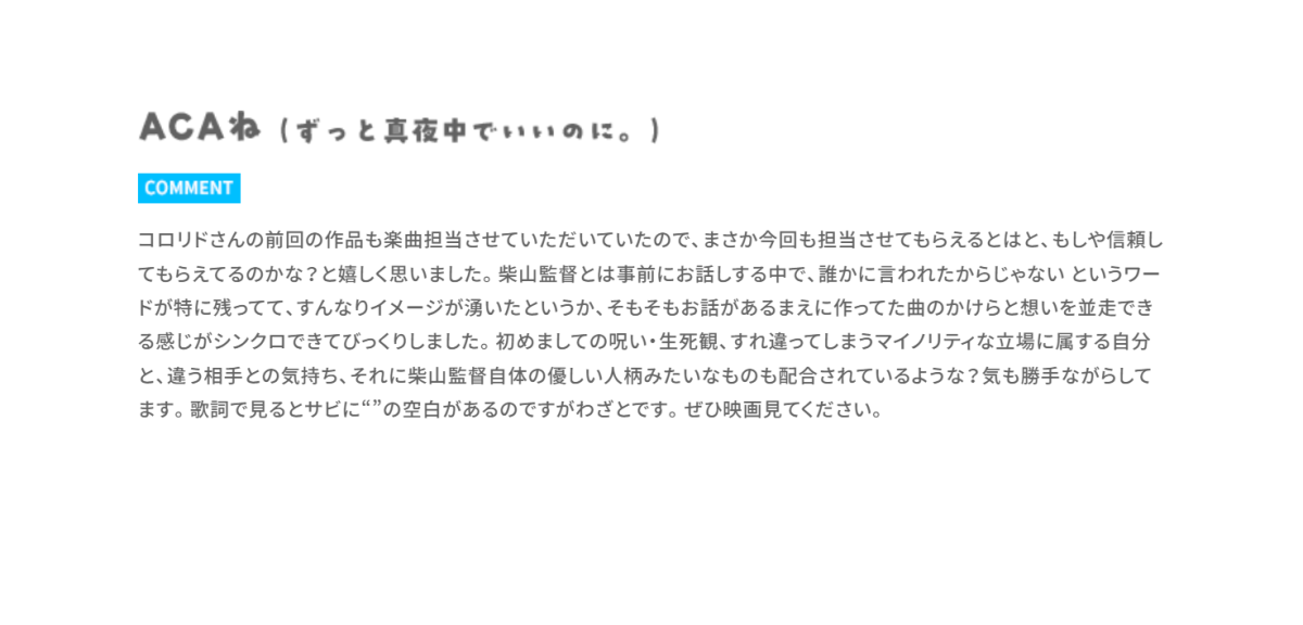 ACAね也表示這部作品結合詛咒、生死觀以及觀念立場相反的人的矛盾,是個非常值得欣賞的好作品,自己在主題曲副歌刻意有處留白,相信看過動畫的朋友即能理解。