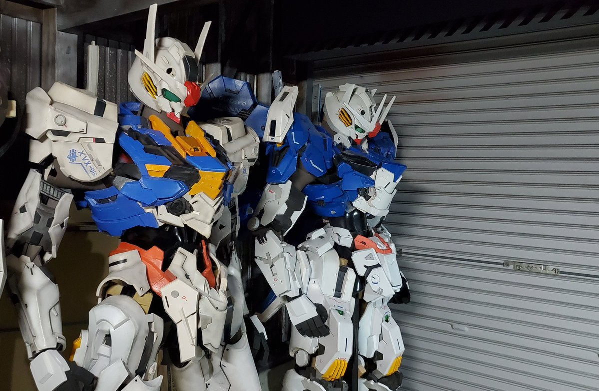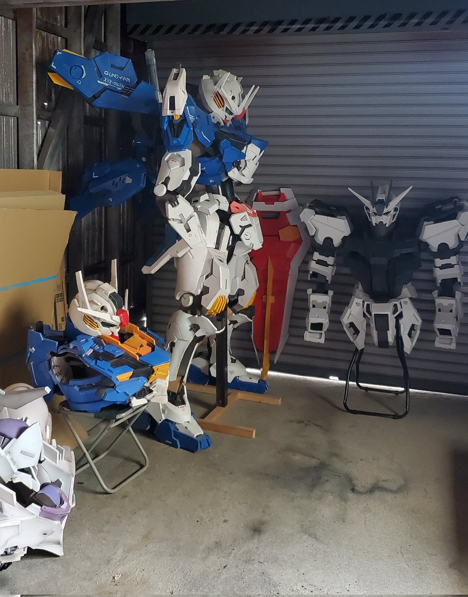 他所使用的就是這個我們日常生活中常見的「巧拼」當作基礎,他並搭配百元商店購入的材料來精心製作成風靈的裝甲,然而他先前就已經完成了一般的風靈鋼彈,擺在一起更加壯觀。