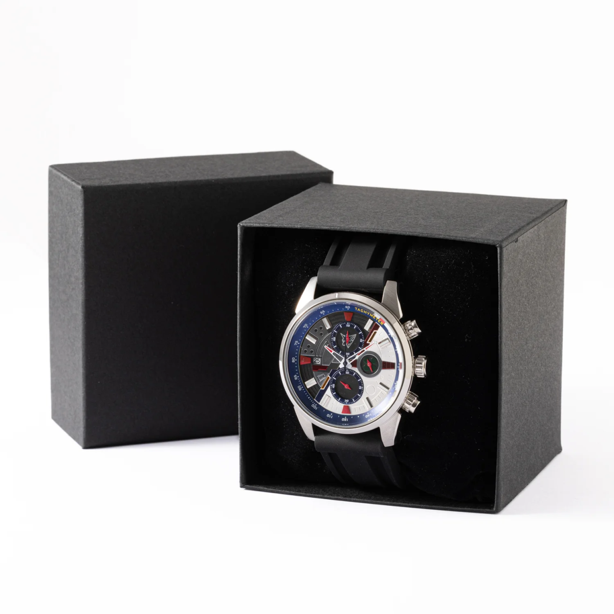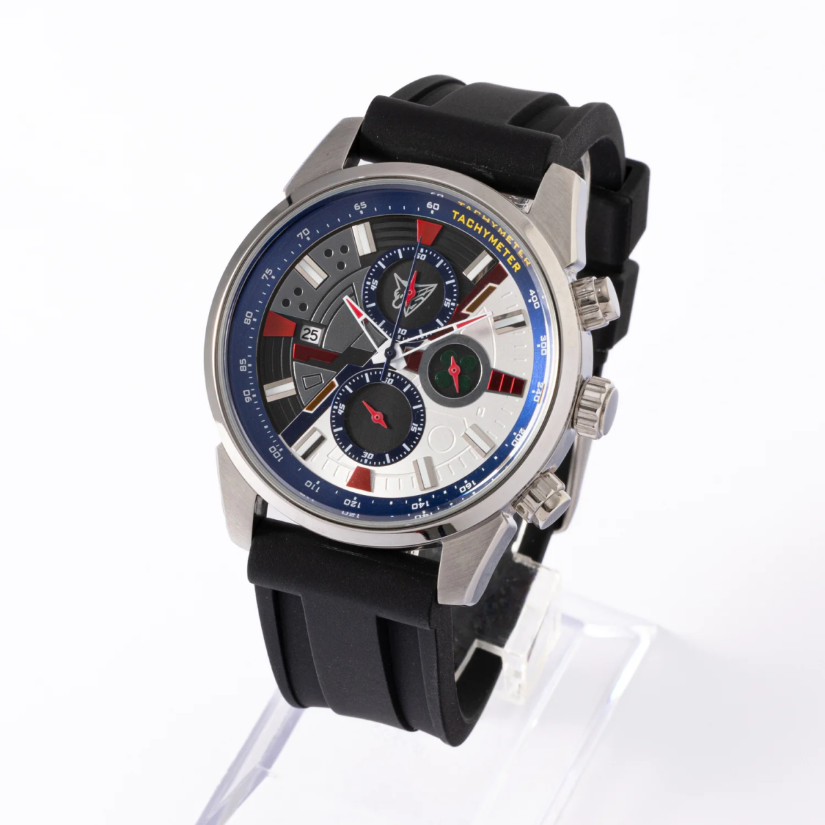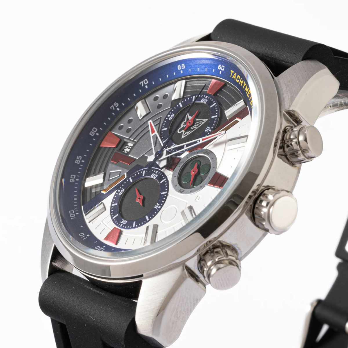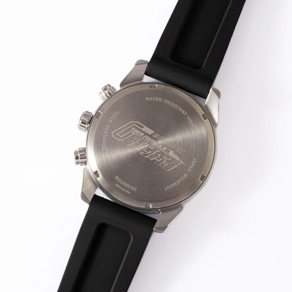 以主角風見隼人所乘坐的「阿斯拉 GSX」為靈感設計,作為車身象徵的 SUGO 標誌和配色,以及錶盤上有著像是車體機械外觀的設計,搭配柔軟光滑的矽膠錶帶,配戴舒適,錶背也刻有作品經典的 Logo 標誌。