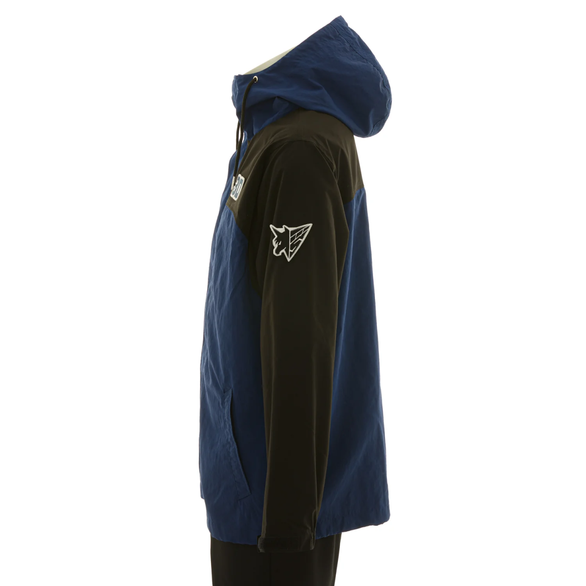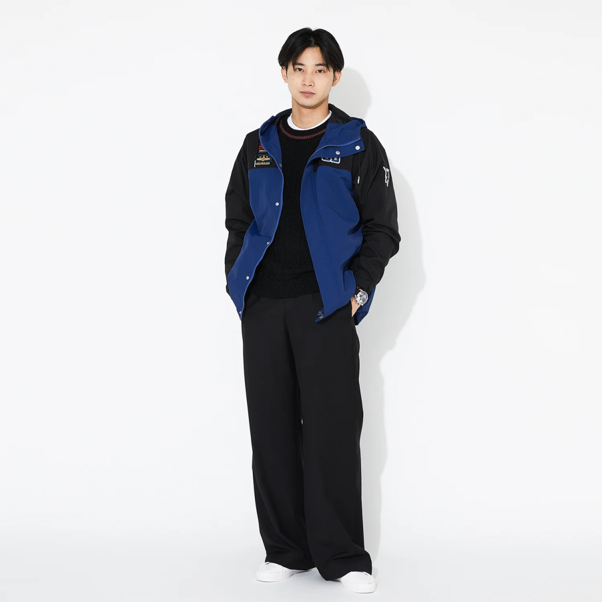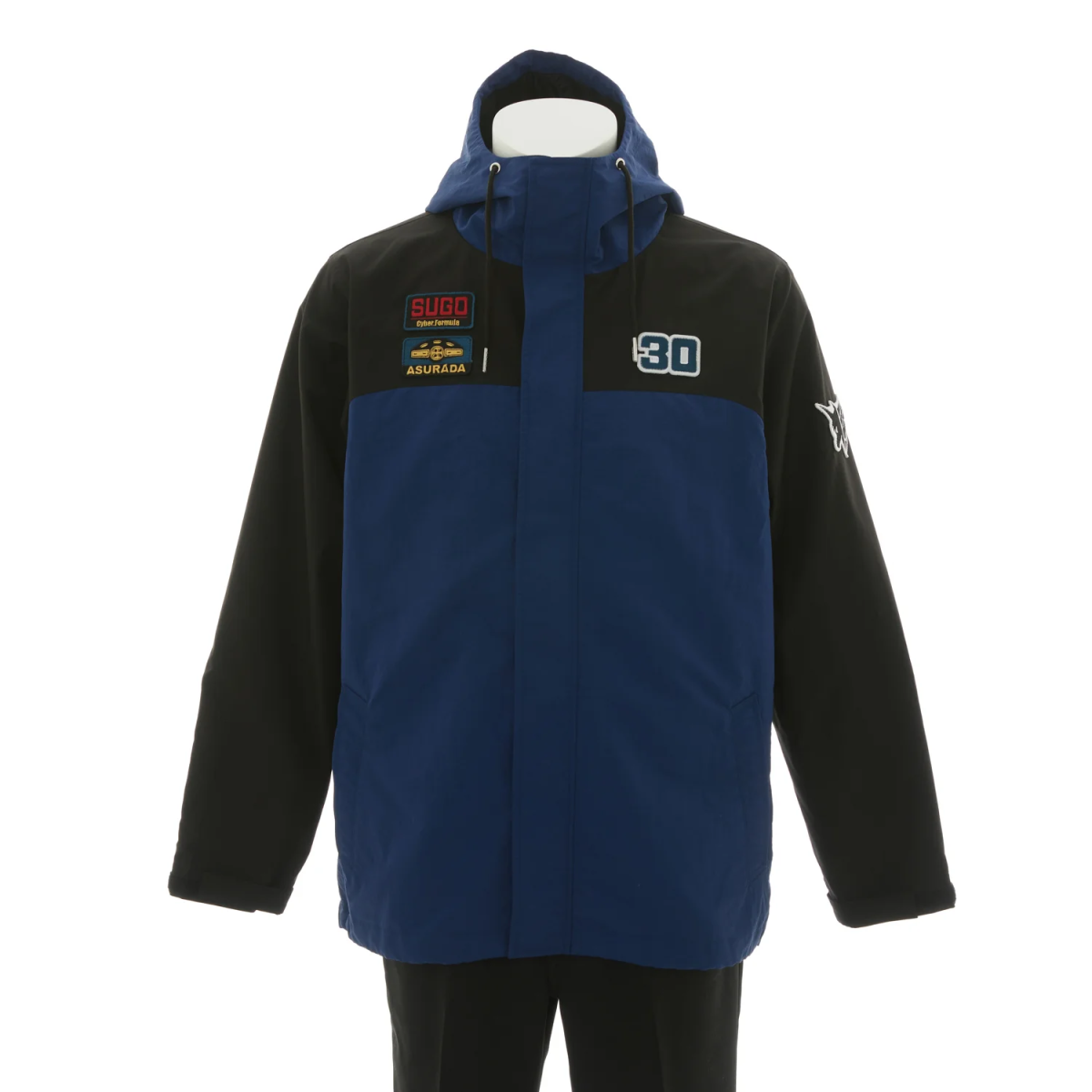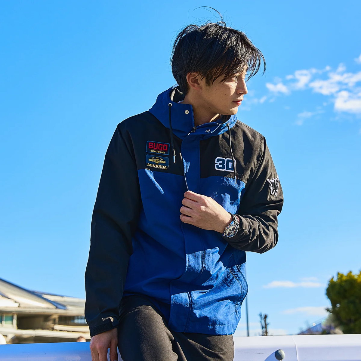 以標準的登山風衣外套為基礎,左右兩胸附有作品 30 周年、SUGO 車隊以及阿斯拉的特製貼布,左手臂處還有 SUGO 車隊的招牌獨角獸圖案。外套本體採尼龍材質製成,輕盈又可以擋風,黑藍配色更是呼應原作的賽車服設計。