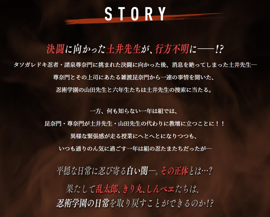根據官方故事大綱,與諸泉尊奈門決鬥後音訊全無的土井老師,被發現似乎與尊奈門的上司雜渡昆奈門相關的事件中有關,忍術學園的山田傳藏老師與六年級學生一起尋找土井老師的蹤跡。