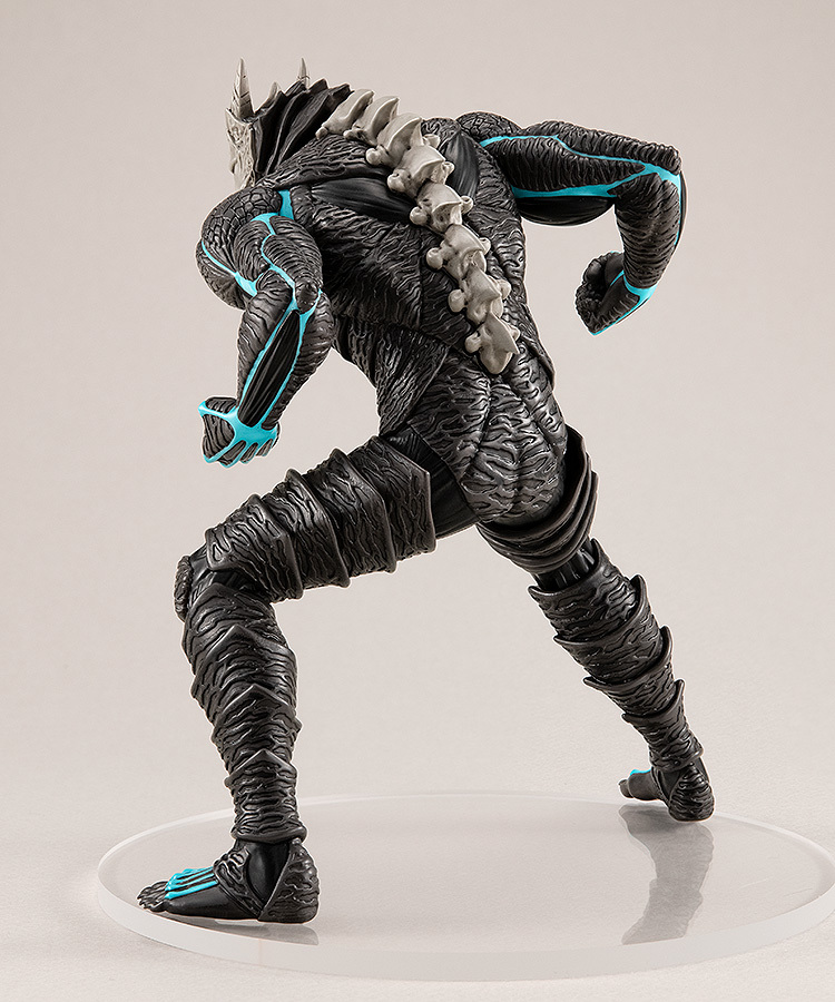 「POP UP PARADE 怪獸8號」高約 17 公分,打造出日比野卡夫卡緊握雙拳並將雙臂向後延展、放低重心準備施展強力一擊的魄力姿態!骷髏一般的面部骨骼、銳利的犄角、自脖子延伸到胸口與雙肩的鱗片狀厚皮、彷彿背鰭般的骨骼,以及將軀體、四肢表面覆蓋住的層層外皮硬殼都有很不錯的刻畫,就連位於髖部、膝蓋硬殼縫隙的內裡肌肉纖維也細緻表現,並將體表的藍色區塊考究還原,不過直視前方的眼神在看久了之後竟然散發出些許萌感!