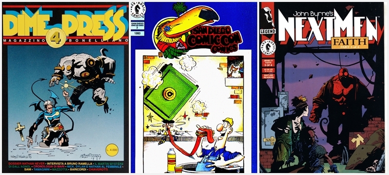 ▼ (從左至右)《Dime Press #4》、《San Diego Comic-Con Comics #2》以及《Next Men #21》,這些最初出現“Hellboy”概念的漫畫,現在都已經是驚人價格的收藏。