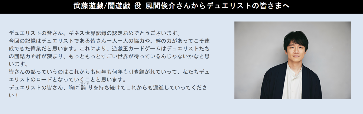 動畫《遊戲王-怪獸之決鬥》武藤遊戲的配音聲優風間俊介也感謝所有參加賽事的玩家致上感謝之意,所有參與的人都像是繫著羈絆一樣,不論輸贏,這次大家在卡牌遊戲賽場上團結一致。也期待所有決鬥者一起邁進,朝向下一個目標前進。
