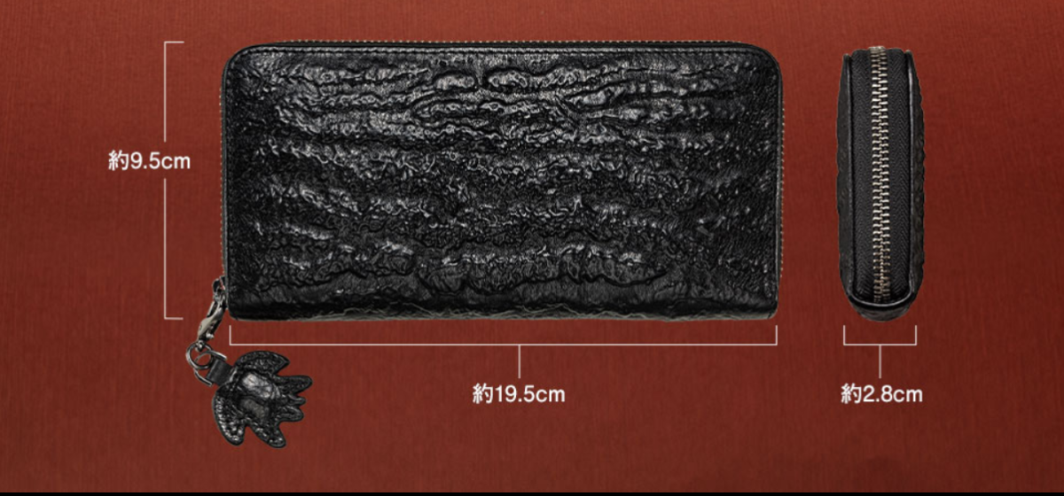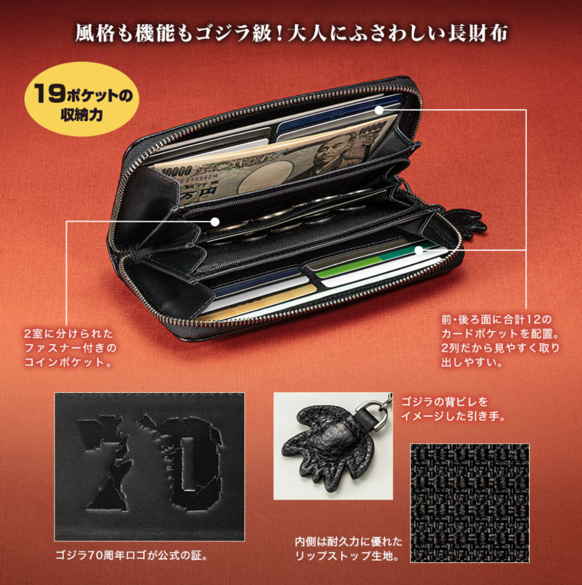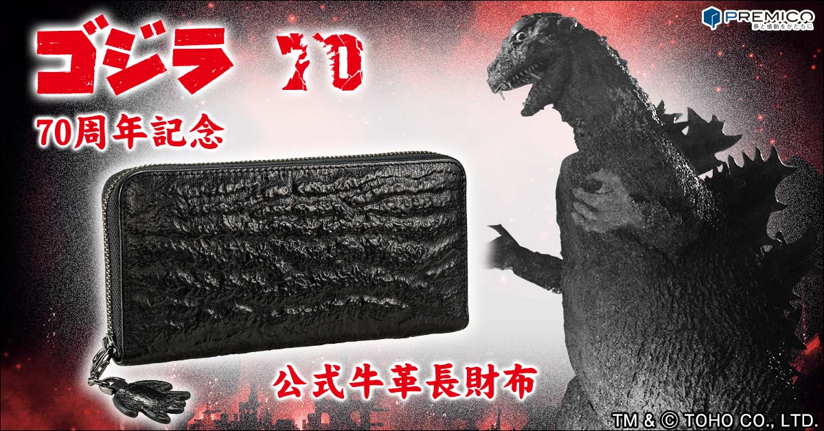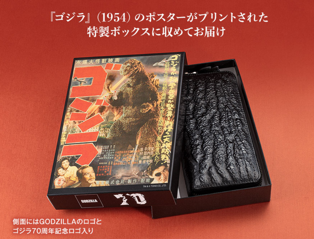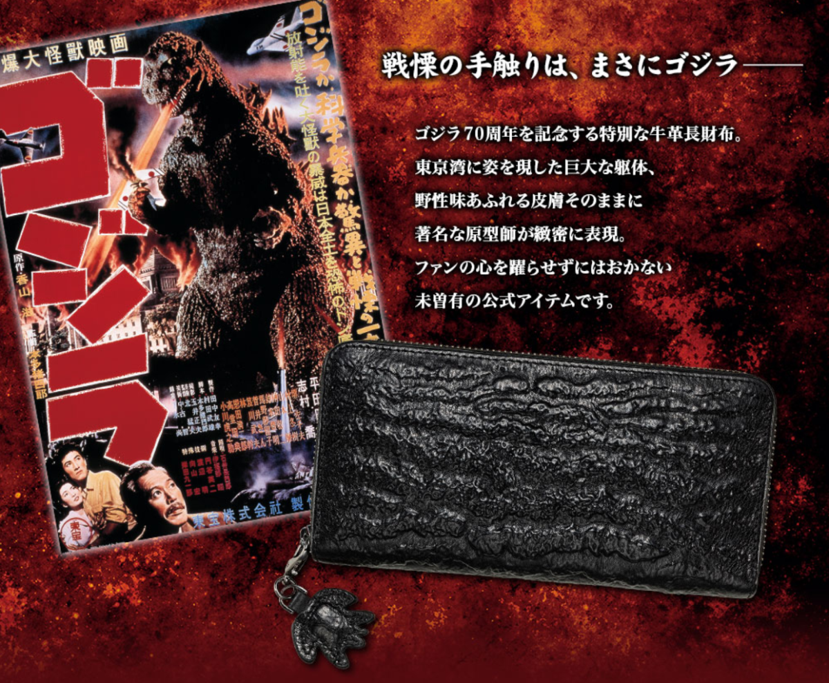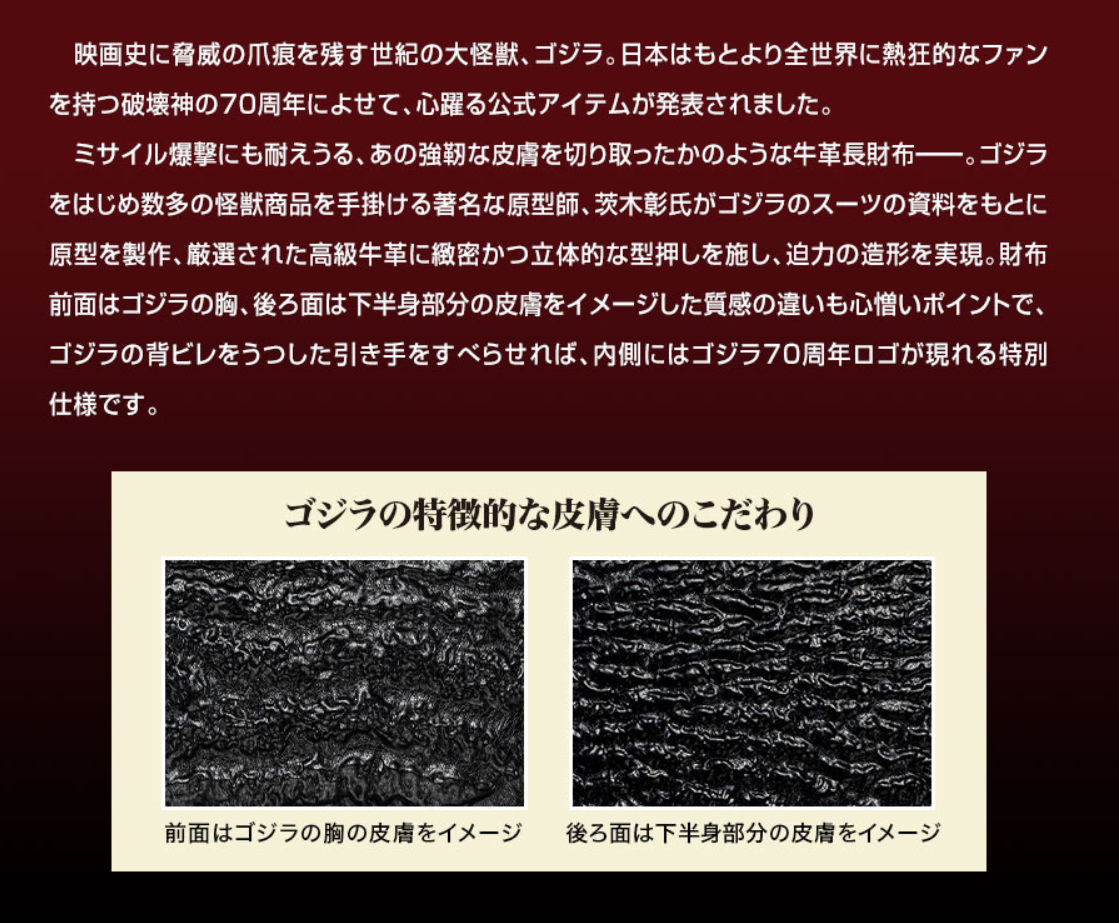 以推出過許多哥吉拉模型、雕像等商品的原形師茨木彰的設定打造,將哥吉拉的皮膚以真牛皮的型式重現在長夾上。大小為長 9.5 × 寬 19.5 × 厚 2.8 cm,是非常標準的長夾款式,日常生活使用非常便利。