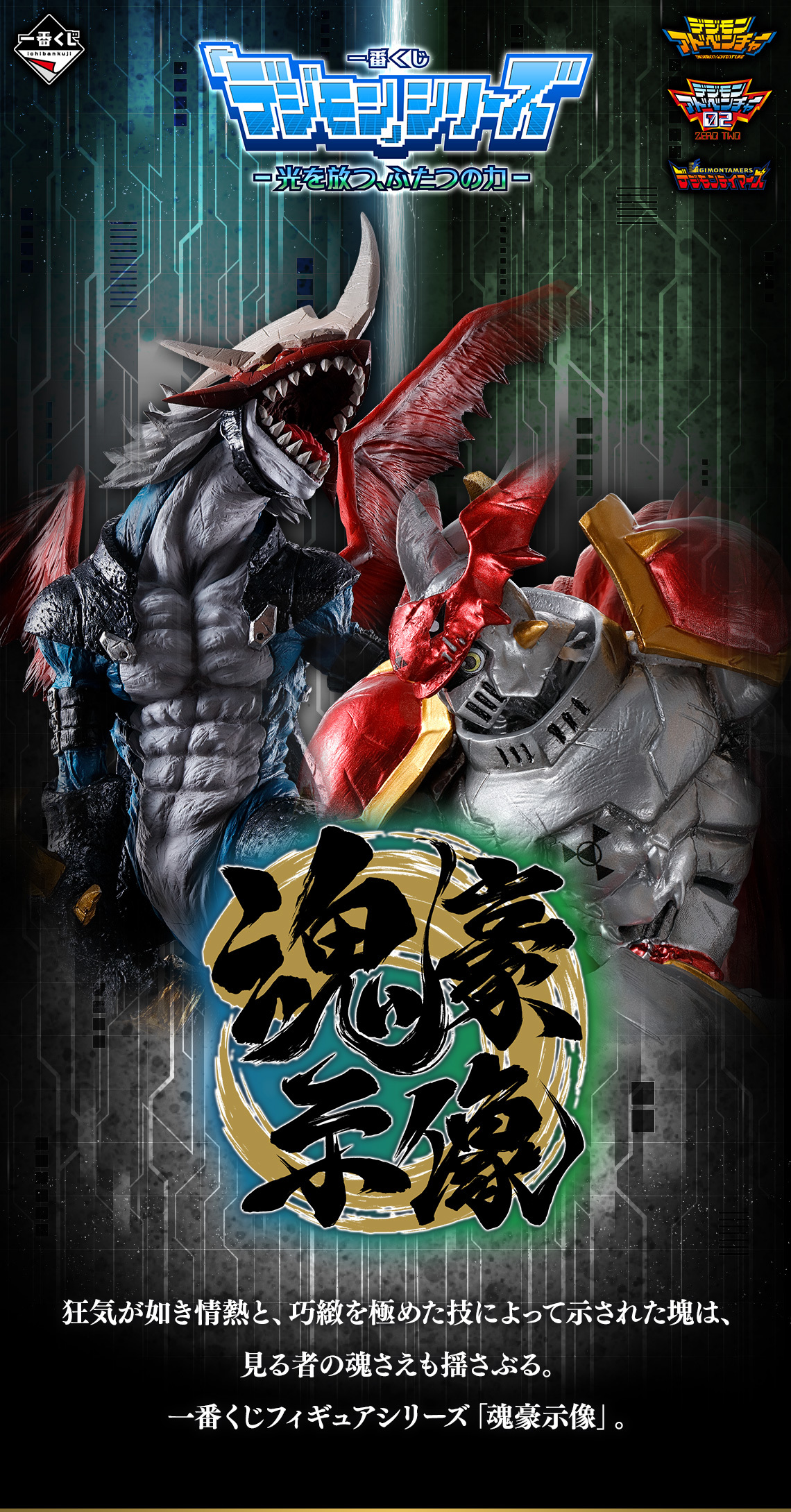 本次「《數碼寶貝》系列 -光芒閃耀的兩股力量-」以《數碼寶貝》系列各代的人氣數碼寶貝為主題,收錄 A~G、最後一賞以及雙重中獎賞等多種級別賞品。其中 A、B 賞最後一賞以及雙重中獎賞是以寫實雕刻再現動漫角色的「魂豪示像」系列模型,分別為 A 賞及雙重中獎賞的「帝皇龍甲獸:龍型態」、B 賞的「紅蓮騎士獸」以及最後一賞的「黑暗戰鬥暴龍獸」,寫實的刻畫搭配霸氣動態展現出不同於作品中的魄力,讓各個強大數碼寶貝的存在感大大升級!