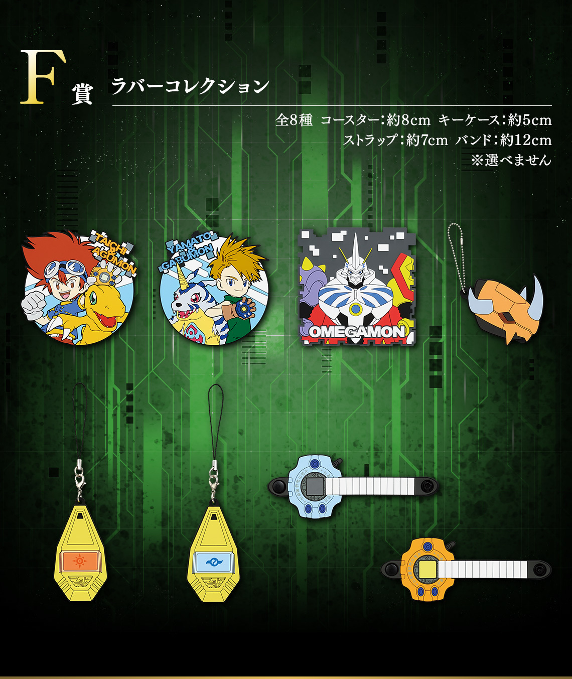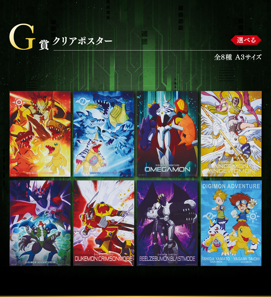 C 賞是「V 仔獸與基爾獸」的模型組合,一賞能夠同時擁有兩隻主角數碼寶貝的模型相當的有誠意!D~G 賞則分別為壓克力立牌、手巾、橡膠製品收藏以及透明海報,每款都印上了滿滿的數碼寶貝主題插圖,被選召的孩子們該準備好你們的錢錢啦!