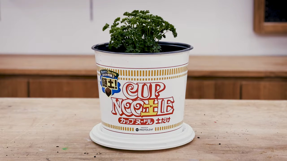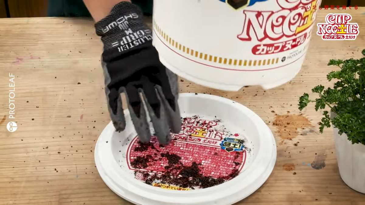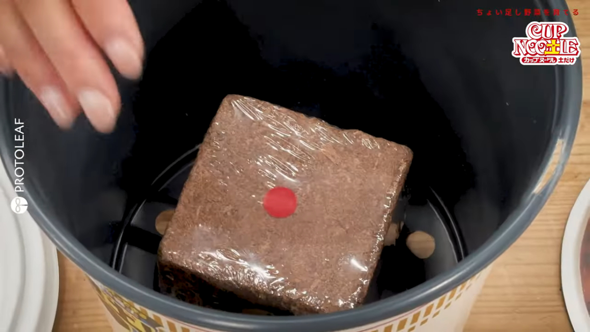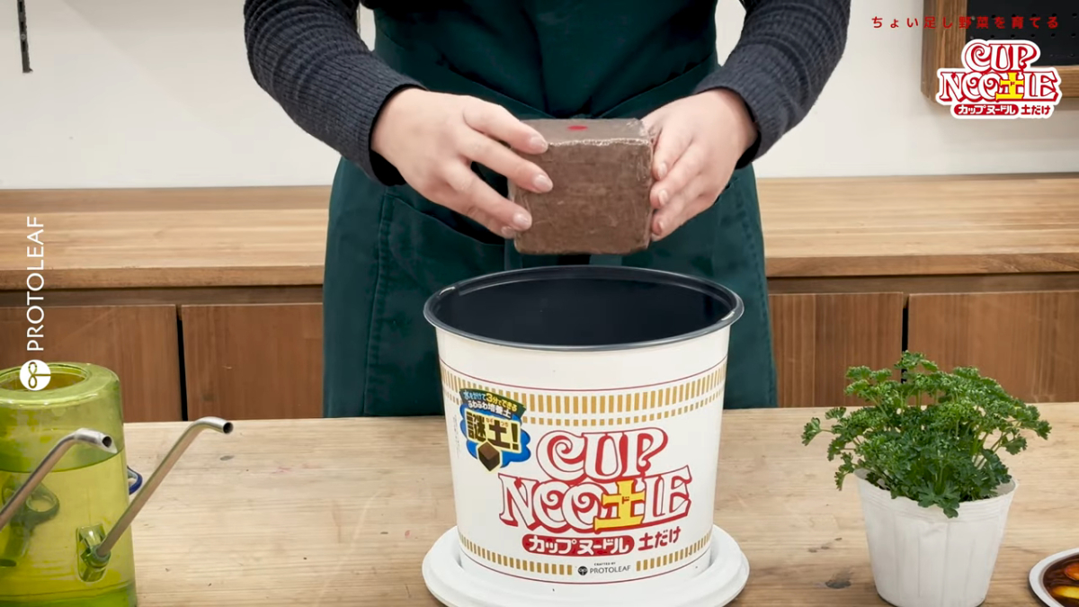 最可愛的部分還不只是這個盆栽的外觀喔,在「Protoleaf株式會社」的介紹影片當中,日清的杯麵盆栽裡還附有一個叫做「謎土」的土壤,簡單來說就是將包裝做成日清杯麵特有的「謎肉」,而也因為採用的是這樣的包裝設計,所以顧名思義也將這包正方體體積的土壤叫做「謎土」,用來種植你想要栽種的任何植物。