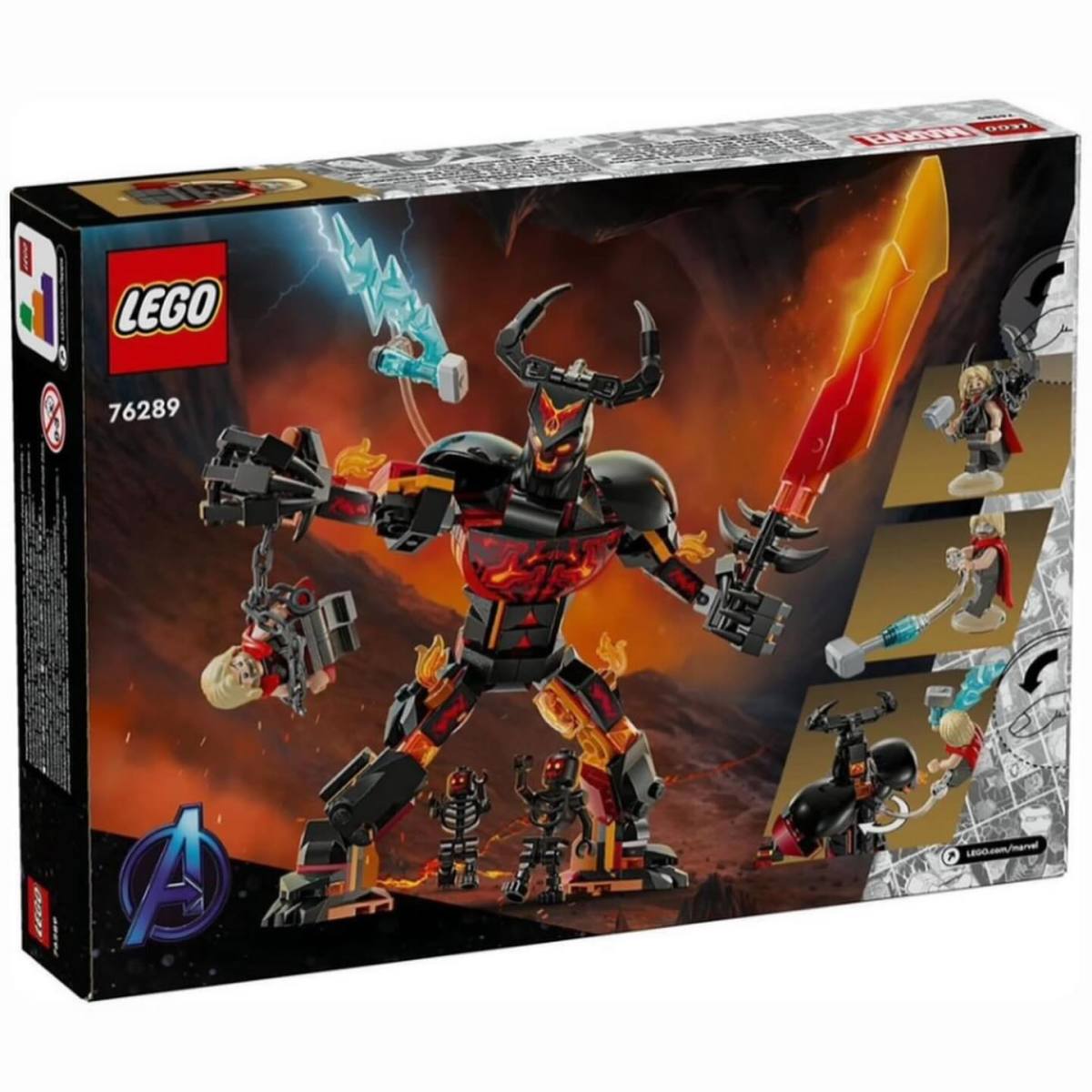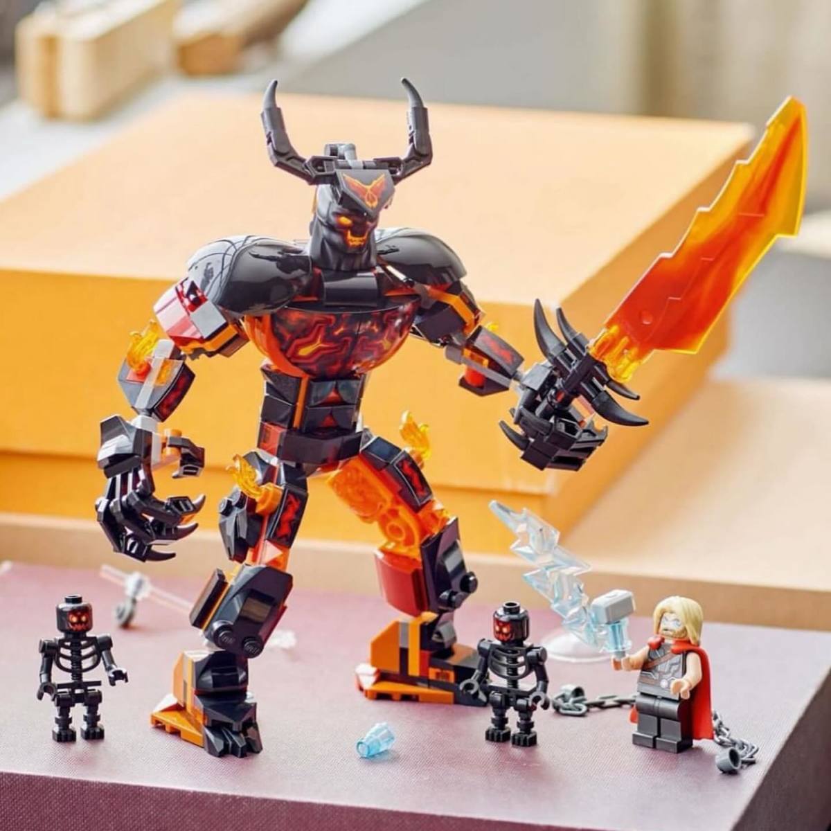 而在把玩「76269 復仇者大廈」時令人留下深刻印象的巨獸利維坦這次也成為 76290 的主角,除了外觀造型看起來真的相當棒之外,還搭載了子彈發射裝置增加可玩性,編號 76289 的火焰巨人蘇爾特爾則是以 Construction Figure 的形式樂高化,以大量黑色零件搭配橘色火焰特效、半透明的橘色零件打造出劇中視覺效果,還配上一把魄力的火焰大劍!