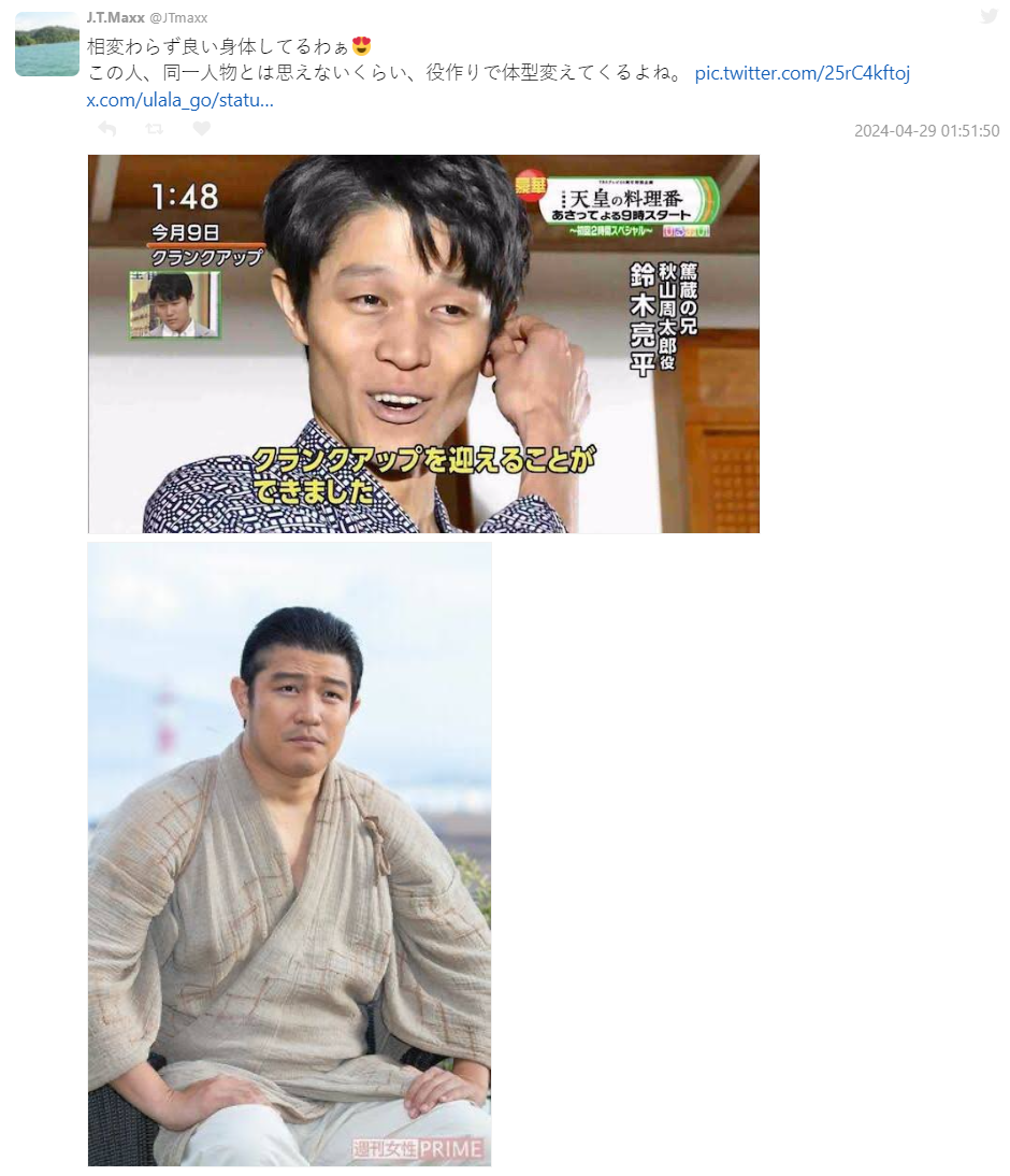 鈴木亮平的演技的確受到肯定,過去演出戲劇也時常因需要讓身體激瘦或養胖,看到下面過去演出的劇照,很難想像是現在肌肉爆棚的獠。