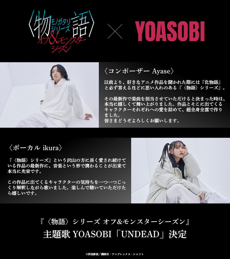 YOASOBI 團員 Ayase 跟 ikura 也表示對《物語系列》的喜愛,這次能擔綱新作動畫的主題曲,這次歌曲「UNDEAD」也是針對本篇劇情特別撰寫歌詞與編曲,希望各位粉絲能夠喜歡。