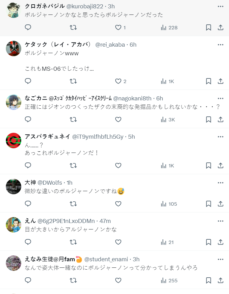 引起討論的這張,其實是出自《∀鋼彈》 ( 又稱 Turn-A鋼彈,逆 A 鋼彈 ) 的機體-ボルジャーノン ( 伯爾加納或博加農 ) ,由於∀世界觀較鋼彈其他作品較為特殊,這長相跟薩克相似,在劇中於魯迦納領土內挖掘出舊文明「黒歴史」 的 MS,正確史觀中並不叫薩克,只是長得很像,還承襲吉翁軍 MS 常有的單眼設計,但可以發現眼眶的軌道中間略寬,眼睛看起來比起薩克較大。