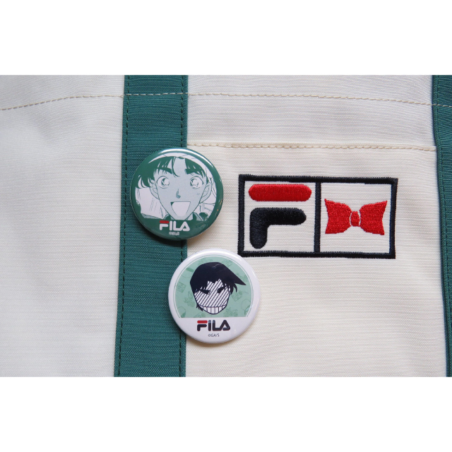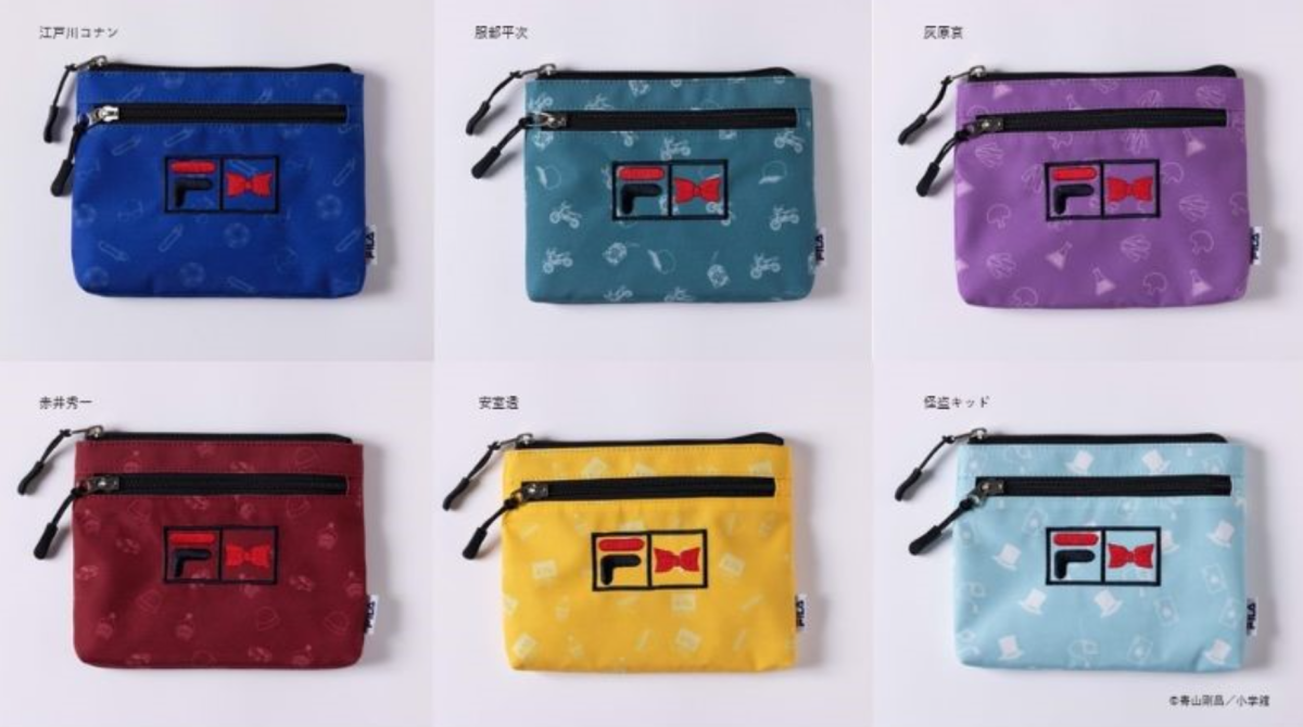 包含六個角色款式 : 江戶川柯南、服部平次、灰原哀、赤井秀一、安室透與怪盜基德,分別以各自的代表色出發,包包外以 FILA 的 Logo 搭配柯南招牌的蝴蝶結來當作主軸。每款包都附有對應人物的兩款胸章,內襯附有漫畫滿版的圖騰藏在裏頭,算是小巧思。