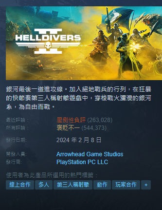 本一發行就深得全球玩家喜愛的多人遊戲《絕地戰兵2》(Helldivers II),日前因在Steam上突發宣布,將強制與索尼互動娛樂(Sony Interactive Entertainment LLC;簡稱SIE)自家帳號PlayStation Network(以下簡稱PSN)後,不只是從原本的好評一路慘跌到「壓倒性負評」,玩家們更是憤而要求官方退費。