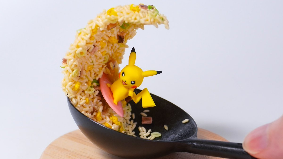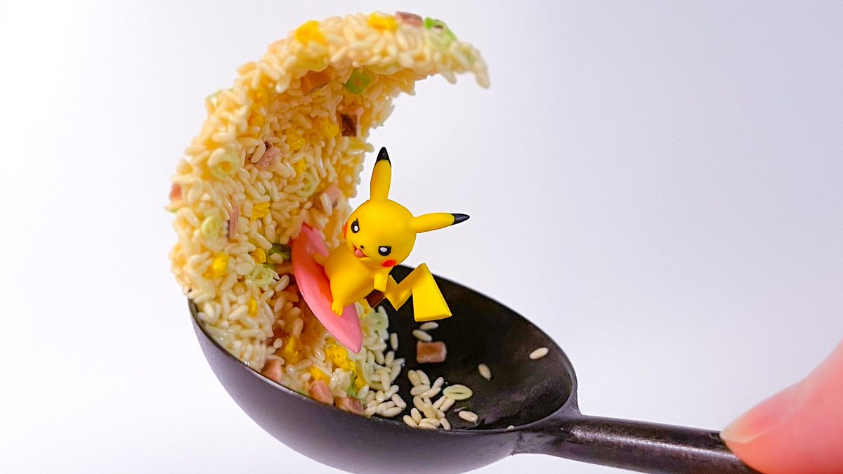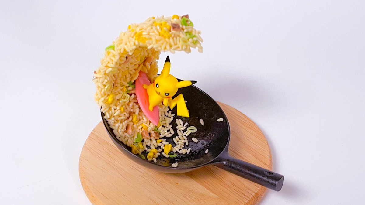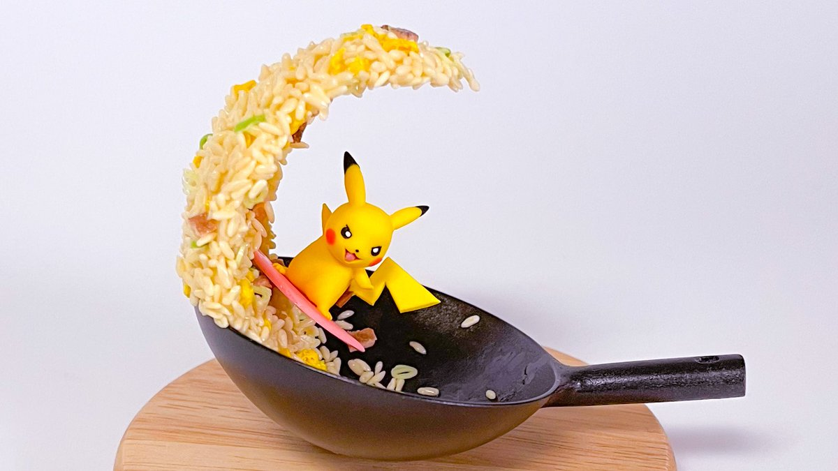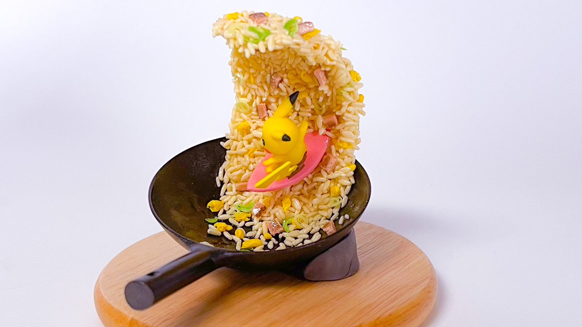 講到「衝浪皮卡丘」其實相信多數寶可夢粉絲都不陌生也不稀奇,但這次ネンドザイカーSNAIL結合了炒飯的概念,讓皮卡丘乘著衝浪板在鍋子裡衝浪,浪花就是各位常見的炒飯。