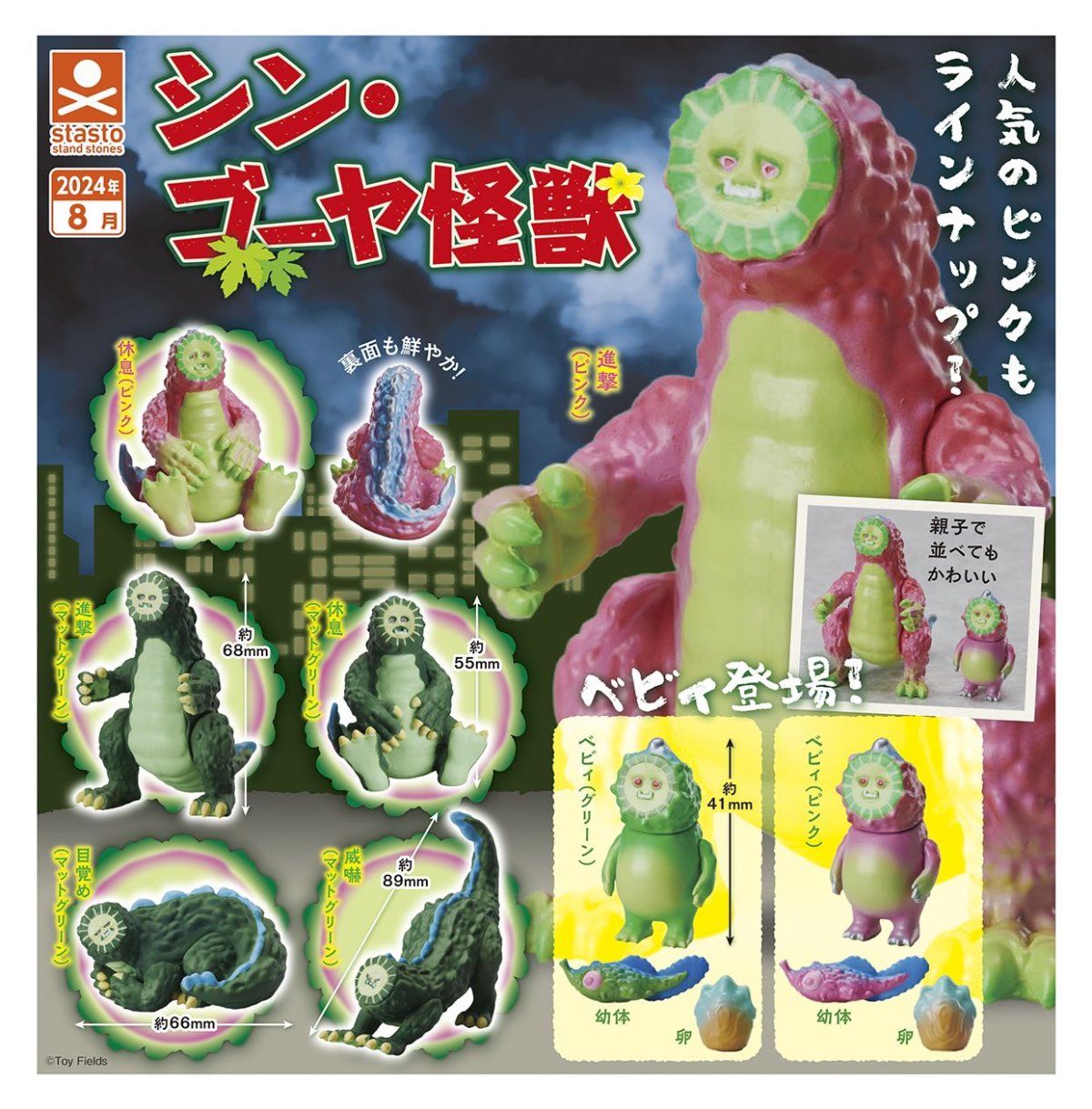 「stasto 苦瓜怪獸第二彈」轉蛋,在 5 ~ 9 公分的尺寸中,還原苦瓜怪獸如苦瓜一般獨特的紋路及身形,並收錄有進擊站姿、休息坐姿、縮成一團睡覺和拱起身體的威嚇姿等怪獸日常的狀態,這次換成霧面綠塗裝再度登場,並有特殊粉紅色塗裝的進擊/休息造型,身後的背鰭施以藍色的漂亮漸層~另外還有首次登場的苦瓜小北鼻、幼體、卵(粉紅/綠色),更完整呈現出苦瓜怪獸的型態變化~親子一起出擊的畫面非常讓人期待!