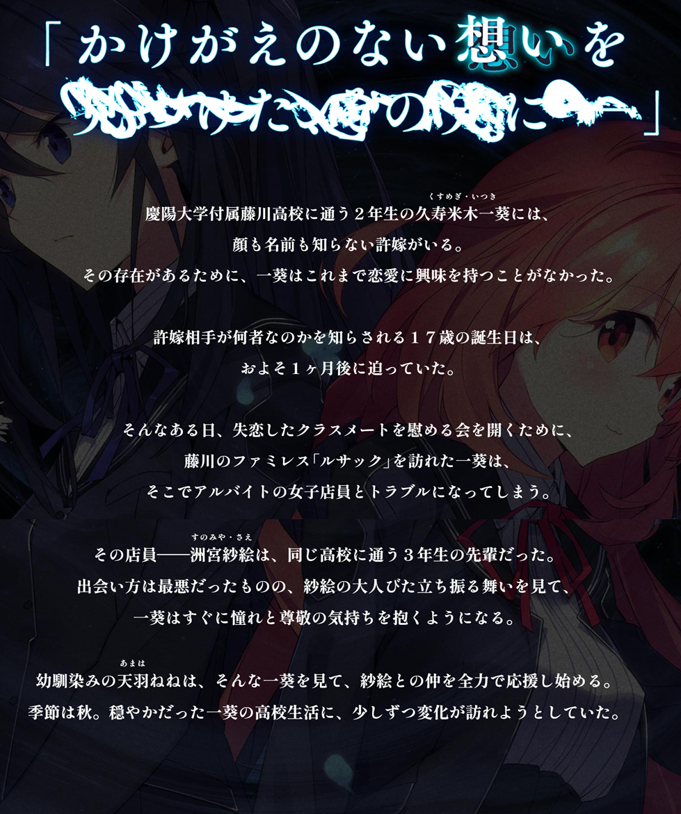承襲過往以「無法取代的回憶」作為劇情主軸,這次故事主角為高中二年級的久壽米木一葵,有個已許下婚約,卻臉沒見過也不知道名字的未婚妻,即使如此,他卻對戀愛一點興趣也沒有。距離他 17 歲生日還有約一個月 ,他就會知道他的未婚妻是誰。