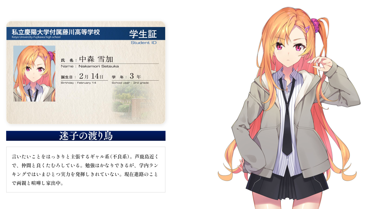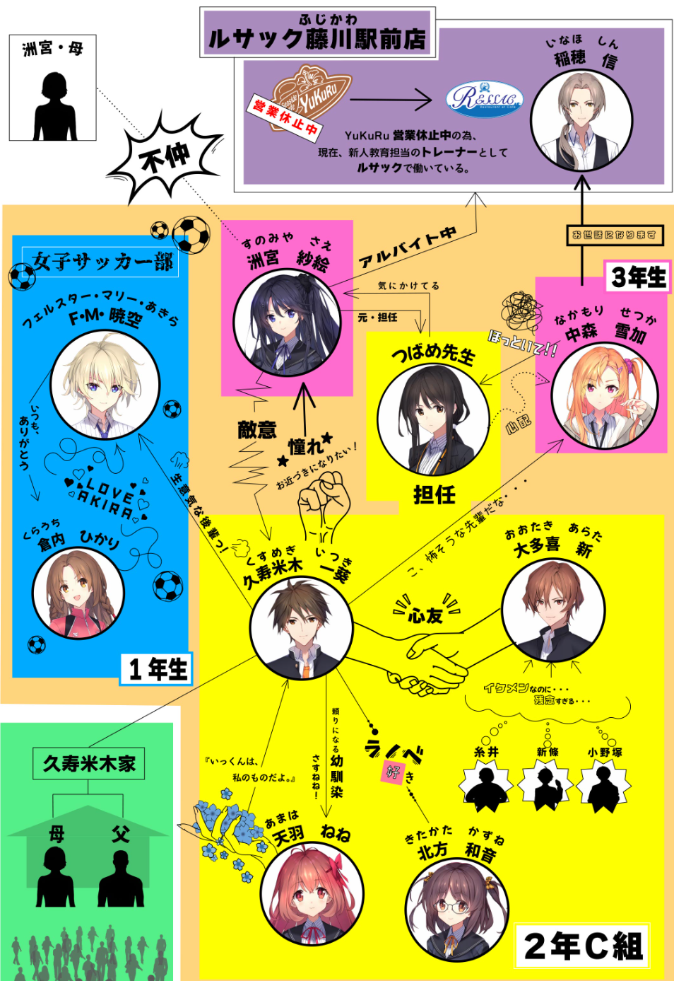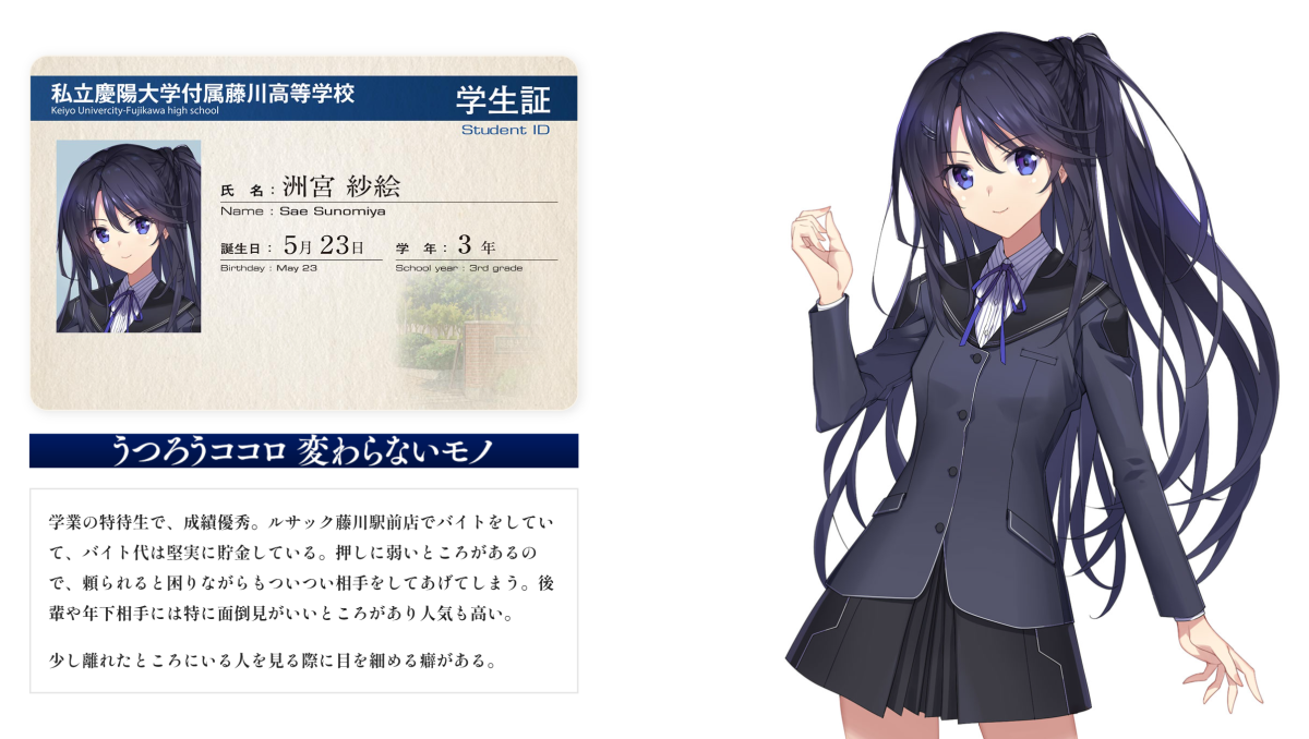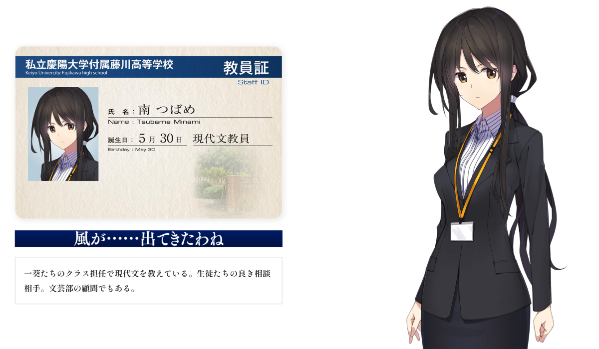 目前官方公布的人物關係圖,如果熟悉該系列的會發現老師南燕 ( 南つばめ ) 其實是出現在《秋之回憶2》的老師角色,對系列粉絲應該算是個驚喜。