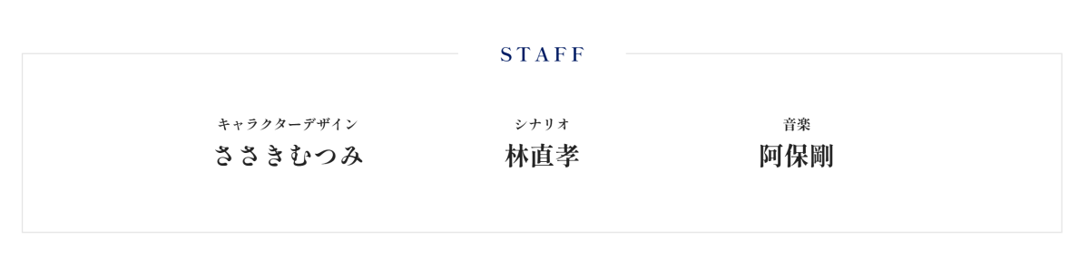 人物原案設定交由該系列長期的佐佐木睦美負責,劇本則是林直孝,音樂則是阿保剛,都是《告別回憶》系列過去的負責擔當。