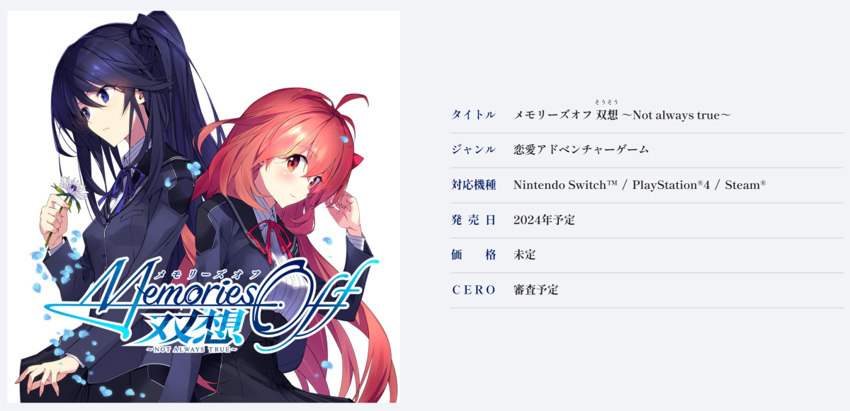 今日 ( 5/7 ) 官方突襲宣布,將推出 25 周年的紀念作品《告別回憶 雙想 ~Not always true~》( メモリーズオフ 双想 ~Not always true~ ) ,預定將於 2024 年正式發行,將登上 Switch / PlayStation4 / Steam 平台。