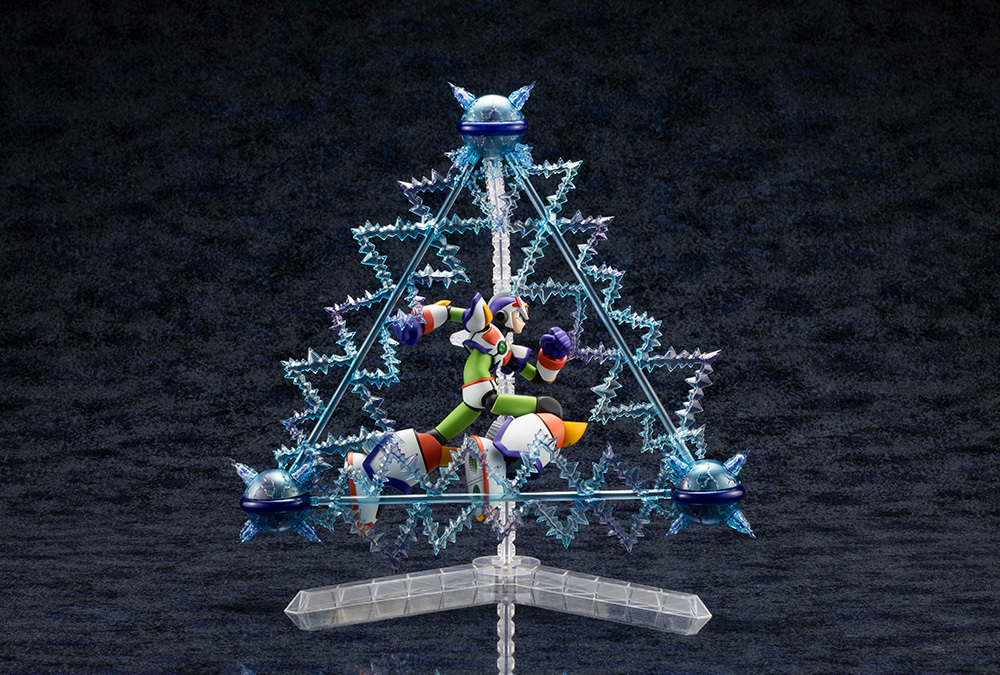 「艾克斯 極限裝甲 三角閃電Ver.」組裝模型,將過去發售的「極限裝甲」套件進行修改,以多色成形零件再現裝甲各色彩,並且附有可重現自然衝刺姿勢的替換頸部零件、扭腰零件、腕部延長零件等多種新追加零件,肩部的裝甲也改為最新結構,可以更自然地賞玩三角閃電的破壞姿勢!最令人注目的角閃電特效零件,尺寸為系列史上最大!大魄力再現圍住艾克斯全身的防禦姿態~