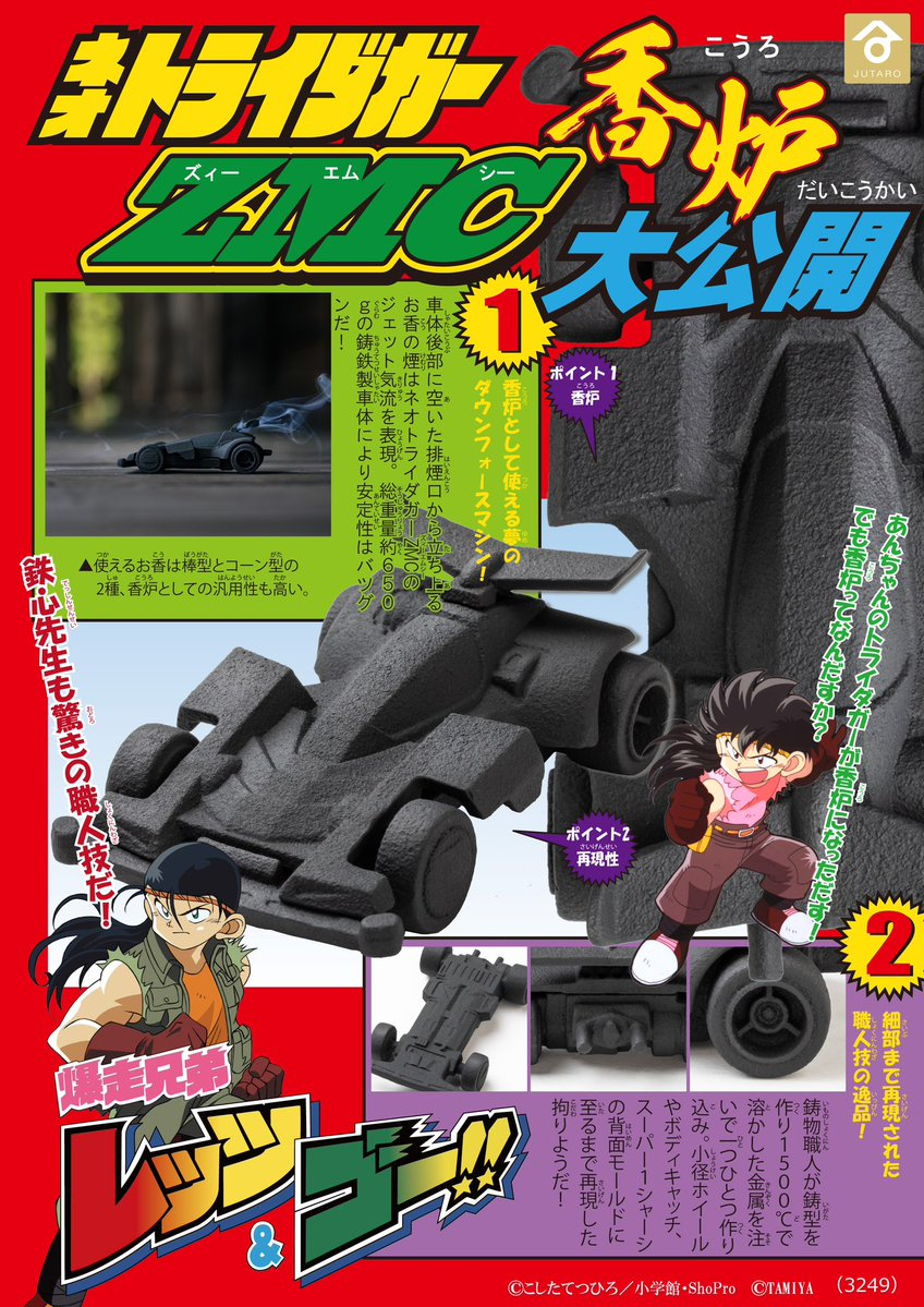 近日日本從明治 23 年開業的老牌鑄造廠「栗田産業株式会社」的自有品牌「重太郎」宣布,將推出以《爆走兄弟》中鷹羽龍的招牌車款「新三角箭ZMC」為造型設計的香爐,以職人手藝製作而成。售價為 33,000 日圓,將於 2024 年 6 月 14 日正式開賣。