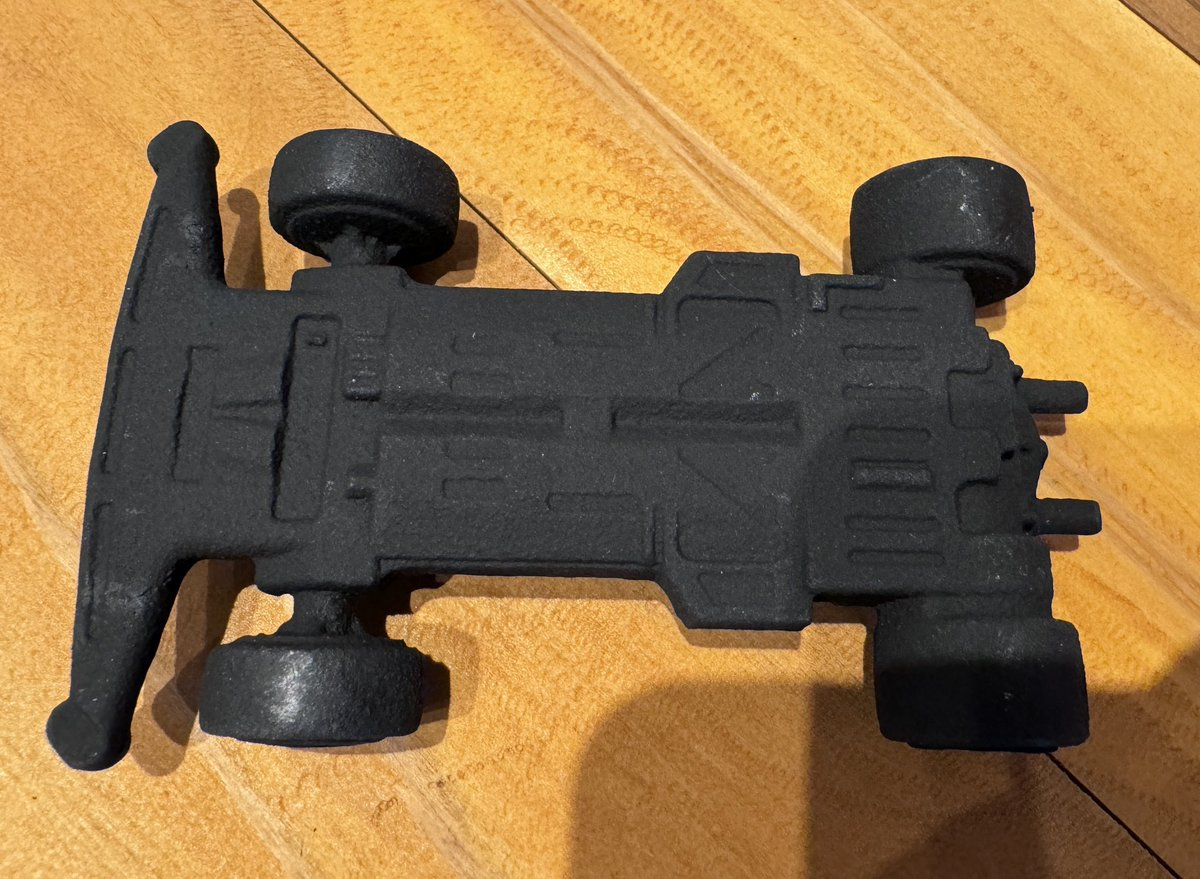 官方示範圖則能見到燒香的煙霧會從車體竄出,就像三角箭奔馳在賽道上的氣流一樣。車體模具也參照 TAMIYA 的設計,忠實的把車輛應有的細節都完整製作出來,雖然看起來是全黑的,輪胎、車殼外型、扣具、底盤全部都真實還原,也看出品牌強大的鑄鐵能耐。