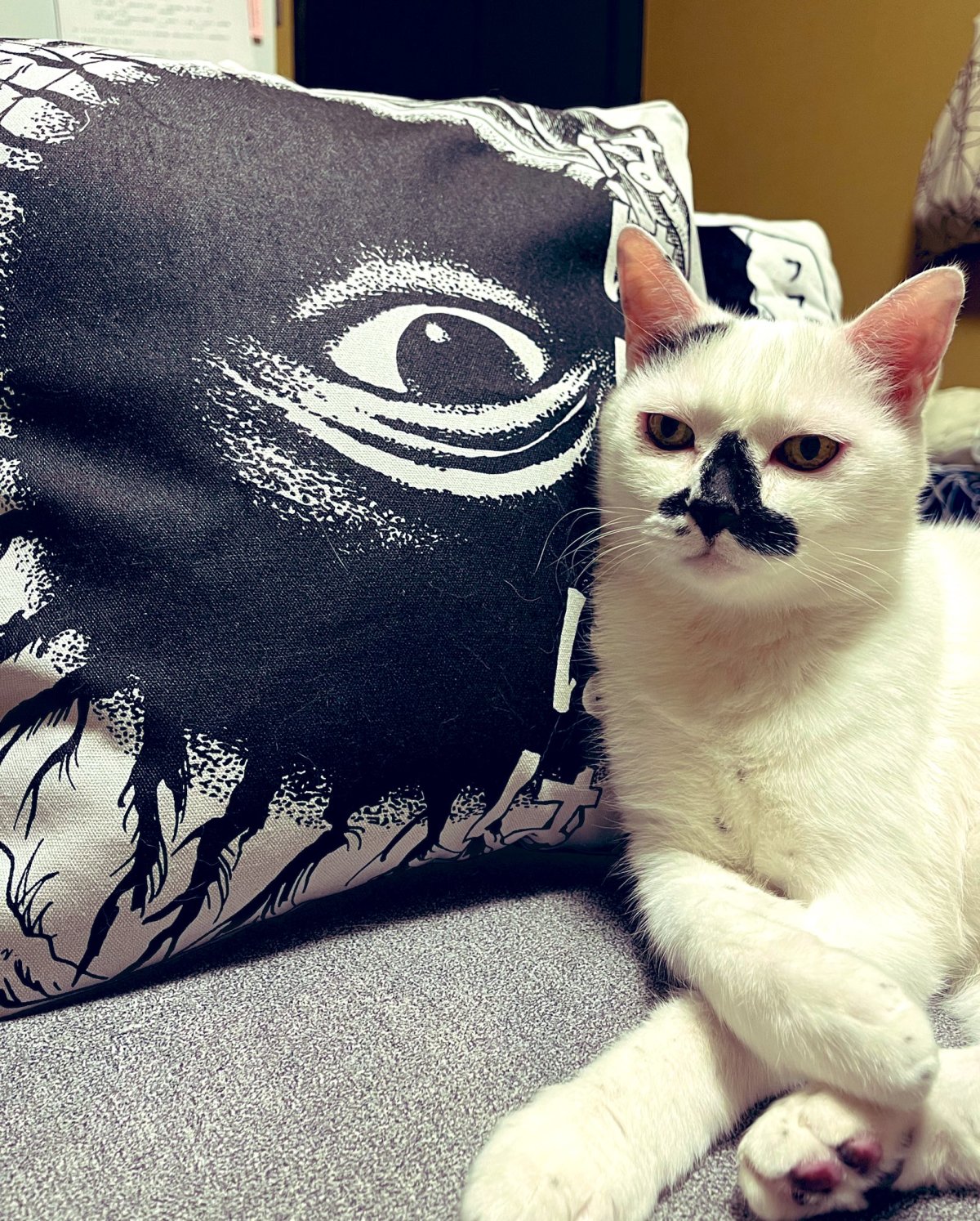玩具人:石黑老師飼養了許多寵物,您在X上經常分享了他們各種生活的可愛模樣。 特別是貓咪「てんまる」與「とんいち」對於老師的創作會有影響嗎? 「てんまる」與「とんいち」會打擾老師的創作嗎?