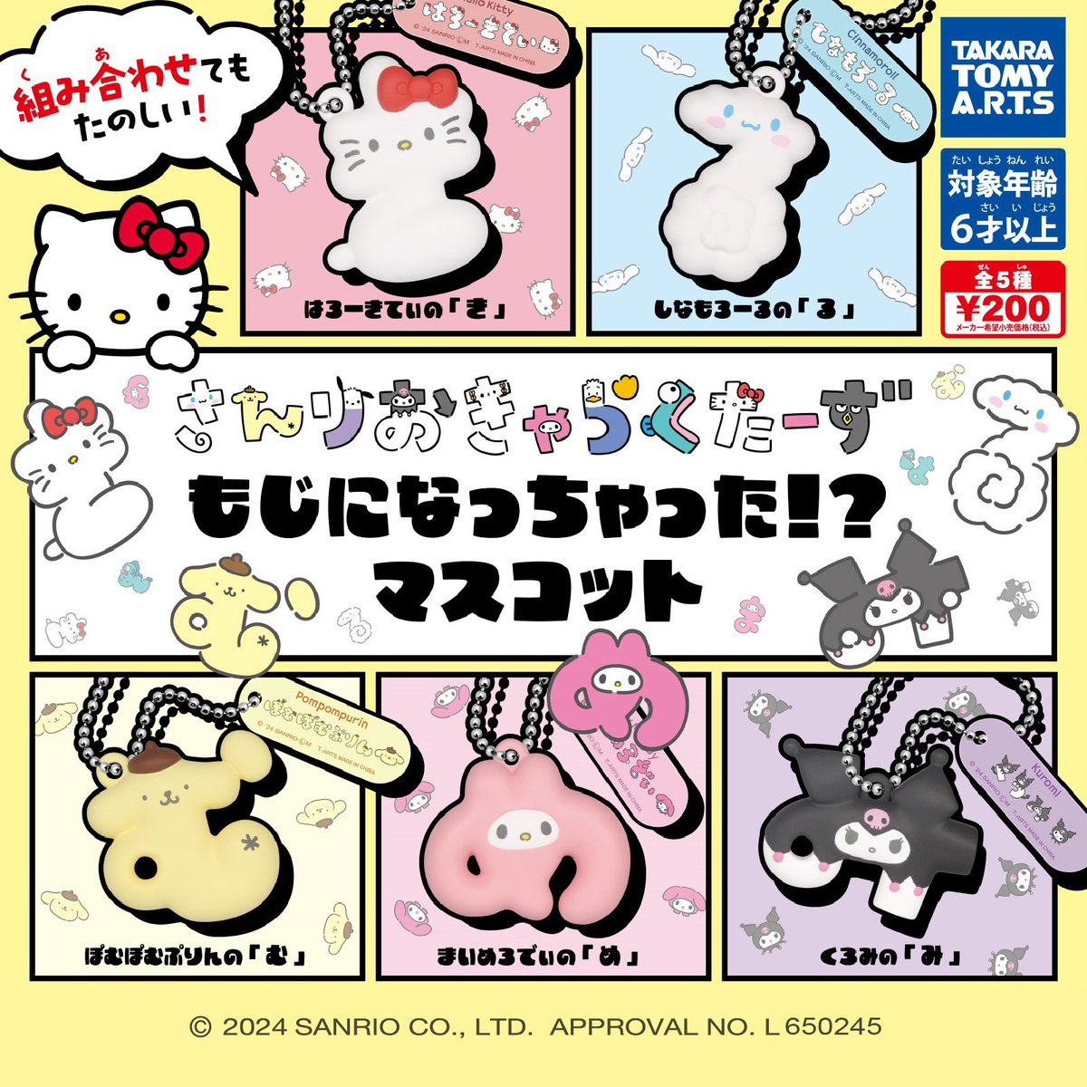 這一款「三麗鷗角色變成 Moji 吊飾轉蛋」( サンリオキャラクターズ もじになっちゃった!?マスコット」 ) 就是將三麗鷗的角色結合平假名的造型,五款吊飾都對應不同的假名。