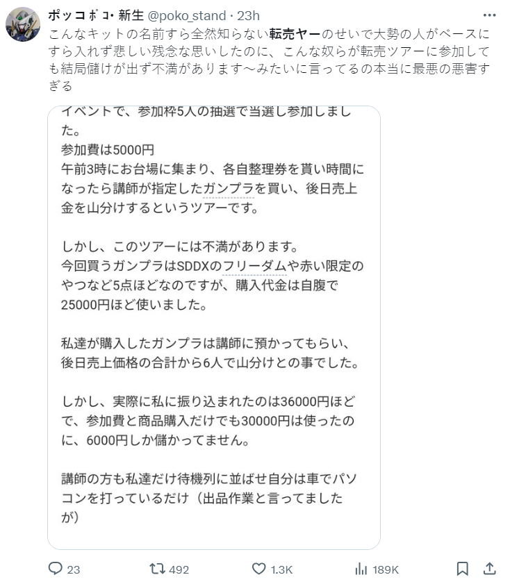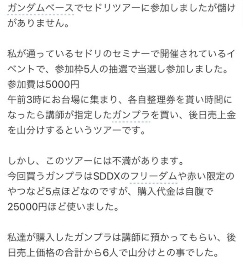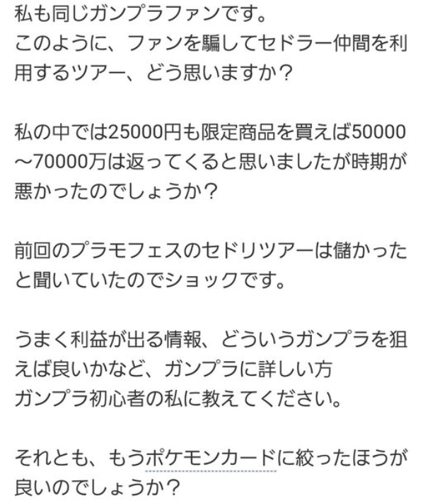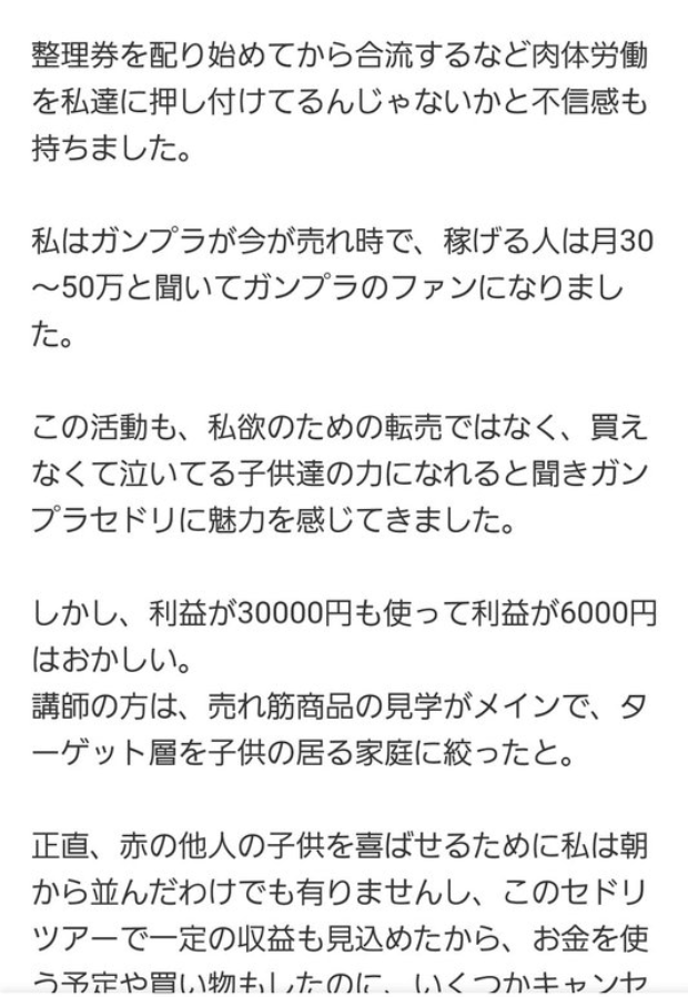 從發放整理券後排隊的勞力付出後,開始對這個模式感到不信任,自己聽說現在鋼普拉賣的特別好,有些人能靠此每月賺 30 - 50 萬日圓,才成為鋼普拉的粉絲的。自認為並非私欲才參加轉賣課程,是認為這樣能幫助那些買不到模型哭泣的孩子,才對轉賣感到有信任感。
