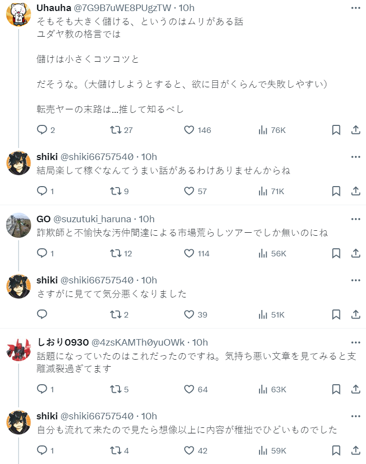 今日 ( 5/10 ) X 上「転売ヤー」成為 X 趨勢關鍵字,原因是有位轉賣黃牛在 Yahoo 發問表示,自己上了「轉賣培訓班」,經過課程教導後發現自己付出了勞力卻賺得非常少,對於這樣的現象感到有點困擾。卻也被網民瘋狂截圖轉發,即使後來因為回應熱烈刪除發問,卻已經在網路上傳開。