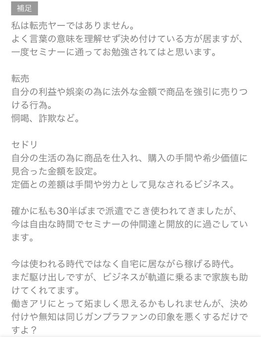 還後續補充自己並非所謂的「轉賣廚」,解釋「轉賣」跟「仲介」的差別,認為自己身為仲介,付出勞力購入這些稀有物品,本來就應該在原訂價跟販售的價格上加上勞力成本,這些回扣是為了自己的生活;轉賣則是為了自己的利益或娛樂用欺詐恐嚇的方式強行高價販賣商品,本質上並不一樣。