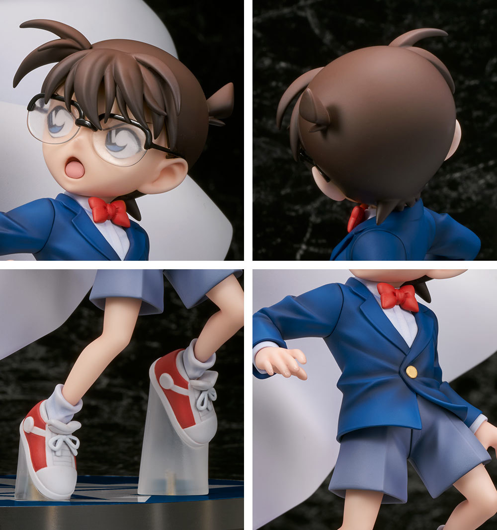 本次的「江戶川柯南&怪盜基德」塗裝完成品高約 29 公分,呈現出柯南和基德背對背的對立動態,從位置上展現出兩人亦敵亦友的關係,在 1/7 的大比例下細緻的刻畫出兩人服裝上的各種細節,基德飄逸的斗篷更是加強了他怪盜的神秘魅力!塗裝部分精準的還原了兩人的配色外,也透過噴塗加強了整體的涼部陰影效果,為整件作品添加更強的視覺張力!