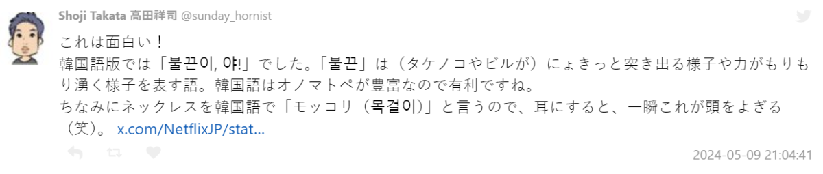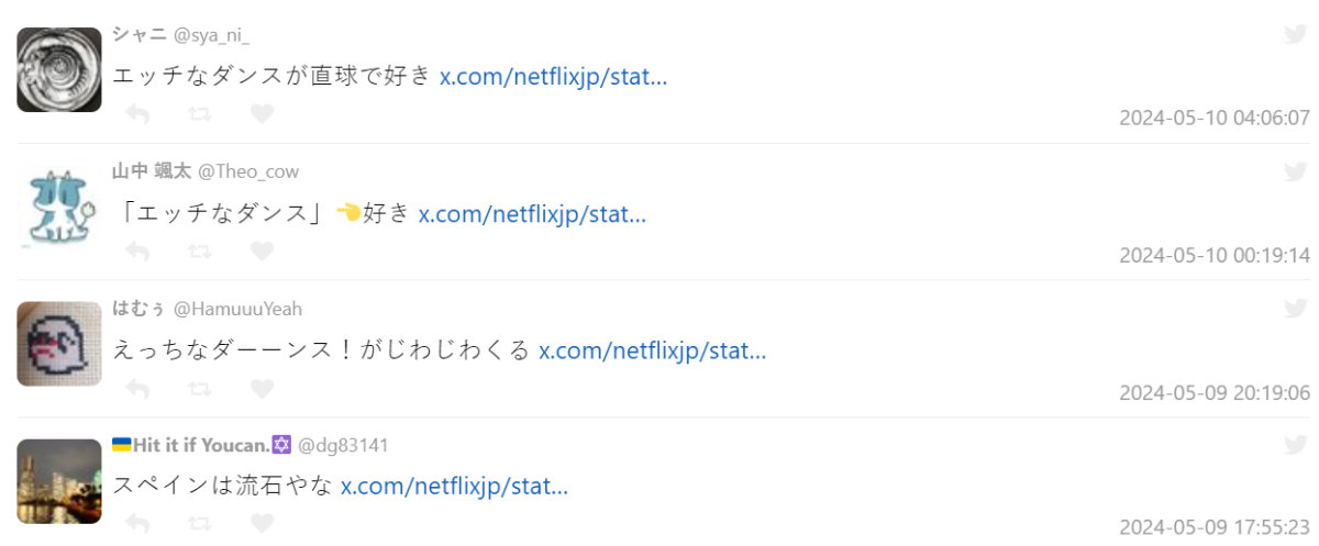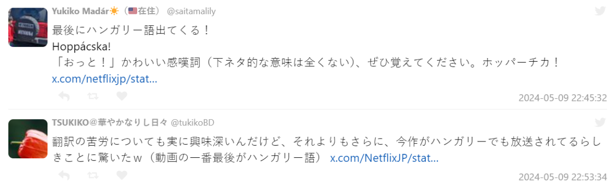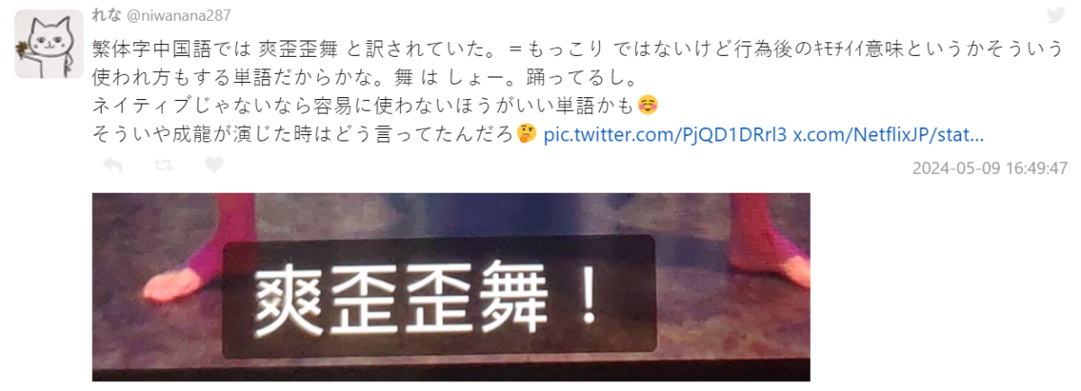 Netflix Japan 所公布的,包含 : 日文版、英文版、法文版、西班牙文版以及匈牙利版,可以看到其實翻譯雖說不太一樣,但都同樣能讓人了解這段舞蹈的趣味。