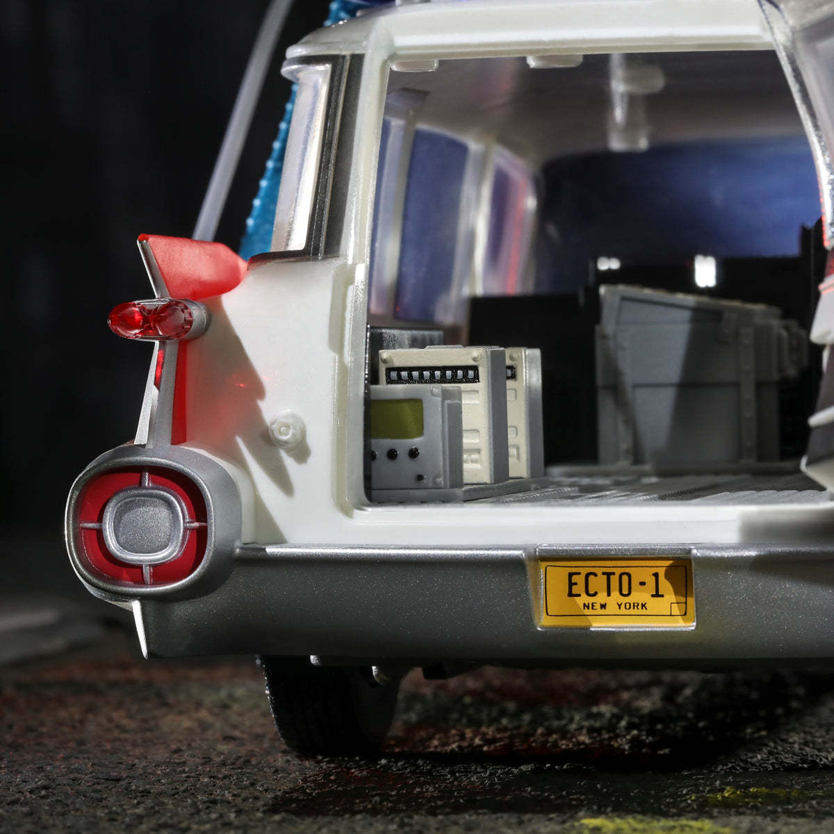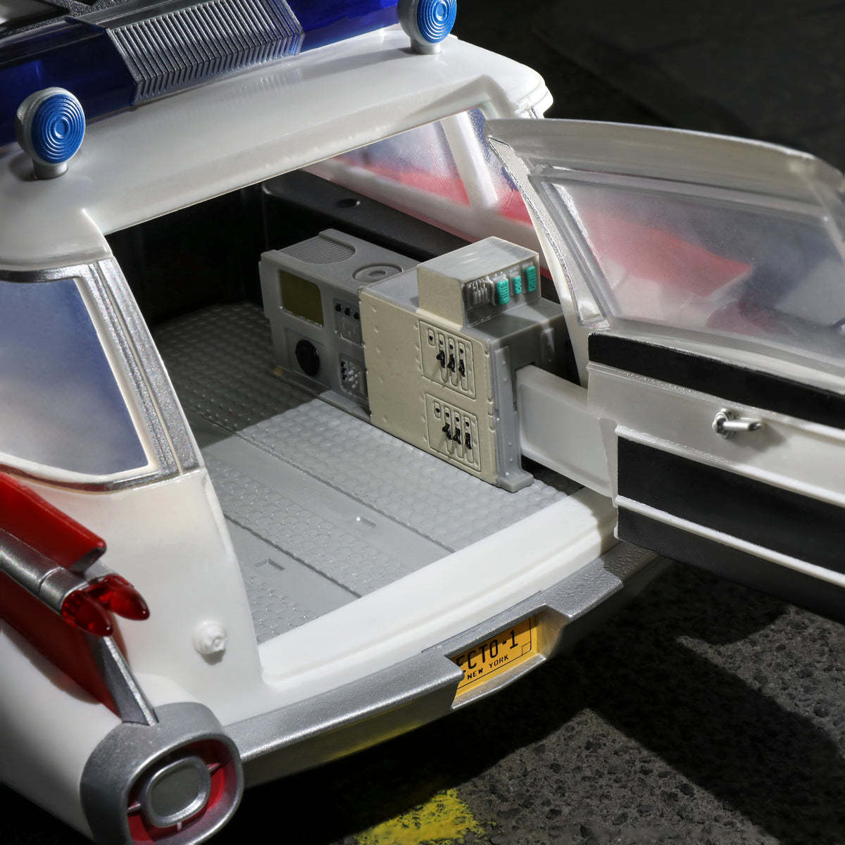 本次孩之寶還原抓鬼車在劇中紅白銀配色烤漆的經典造型,重現了車頂上的定向天線、空調機組、儲物箱、雷達天線罩等裝置,車頭及車尾寫有「Ecto-1 NEW YORK」的車牌也被完美複製!在車體機關上除了車輪的可動外,四面的車門以及後車廂門皆可開啟,更可以從後車廂滑出輪床,細緻的再現了車上的種種細節!而這台抓鬼車也可以搭配先前推出過的《魔鬼剋星》3.75 吋人偶把玩,擺設出劇中的各種有趣場景!
