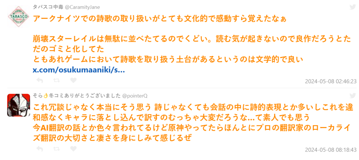 例如像是手遊《明日方舟》就常見上述的對話,翻譯成日文後對日本來說都是非常繞口的漢字語句。