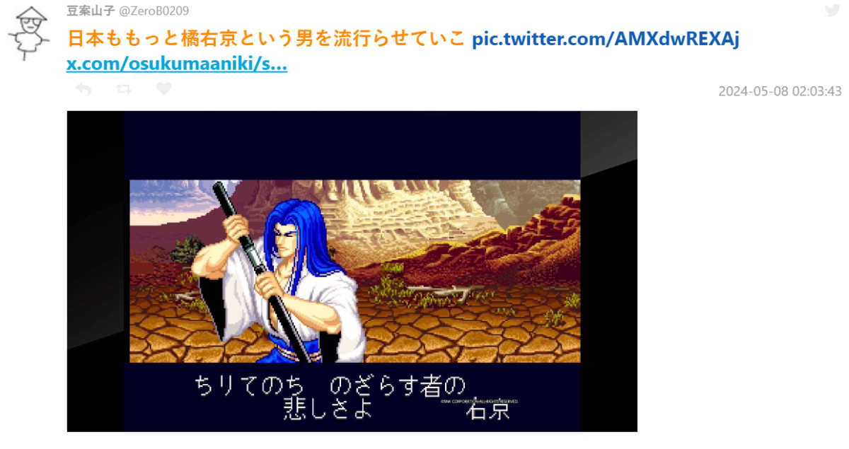 至於日本有沒有類似的案例,則有網友指出《侍魂》系列的橘右京,用了非常多的傳統和歌和俳句,也是特色之一。